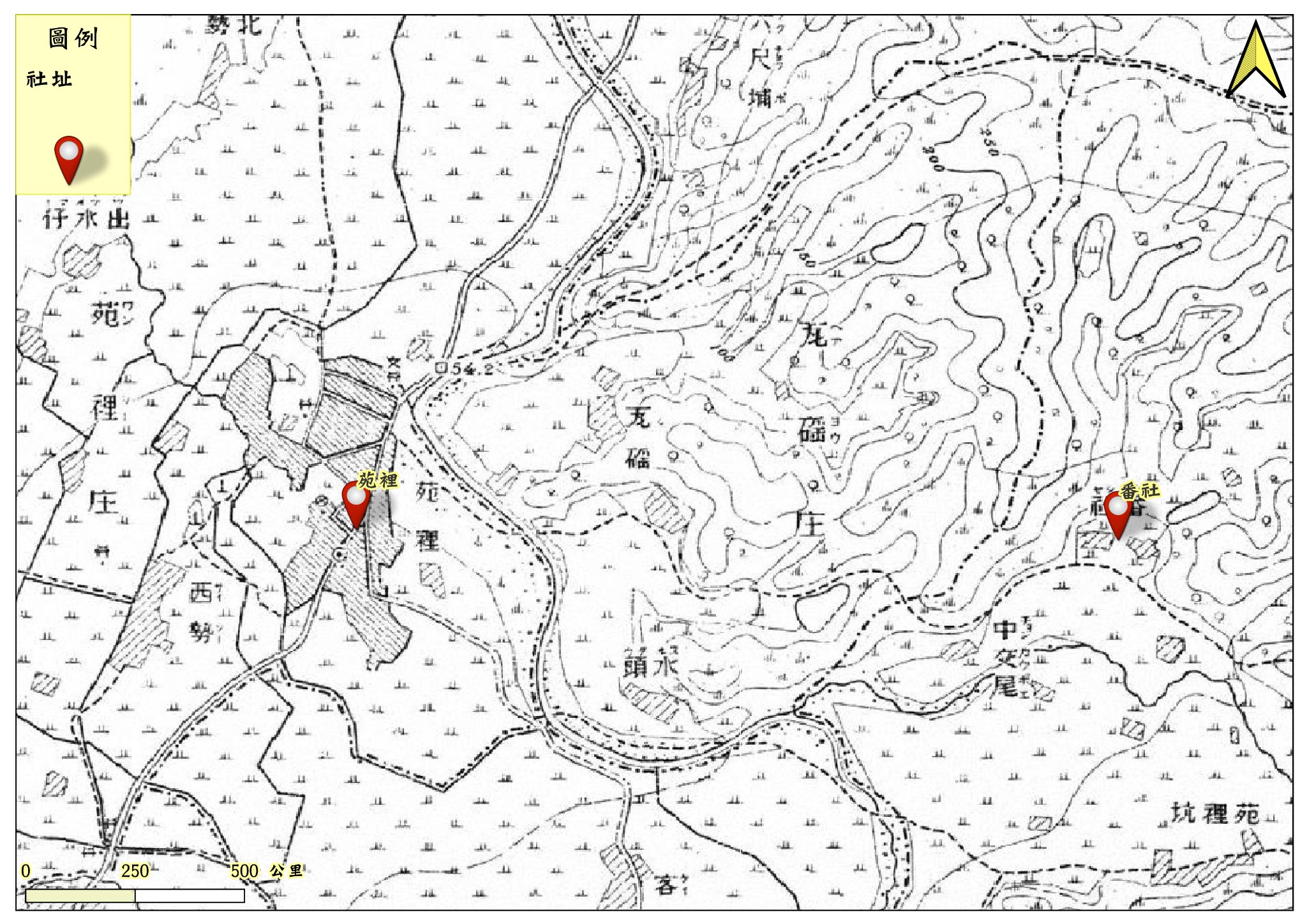 有關苑裡社社址的座落,相關研究多認為是在苑裡(即今苗栗縣苑裡鎮西平里、西勢里、苑南里、苑北里一帶),而潘英海、陳水木則指出,苑裡社應有新、舊兩處社址,分別位於今苑裡鎮苑坑里、苑裡鎮苑東里20鄰一帶。進一步歸納清代方志所載,從1774年(乾隆39年)刊行的《續修臺灣府志》到1871年(同治10年)間刊行的《淡水廳志》中,有關苑裡社的社址坐落均被記載為「距城八十二里」,推測該社在這段時間中並未遷徙;不過,在1897年(明治30年)發行的《新竹縣志初稿》中,卻已改為「距城西南七十八里」,或可判斷該社在此期間,出現短距離的遷徙。此外,根據番差瓦厘學生、阿不見、麻踏頭阿朥萬於1784年(乾隆49年)仝立《賣地租字》可知,苑裡社在當時有部分社番居住於猫盂庄;進一步對照潘步雲、潘阿才於1886年(光緒12年)立〈給山墳契字〉中「宛裡社番潘步雲、阿才等有承祖父遺下山崗壹所,坐落土名舊番社窩仔拨仔林」,可知苑裡社社址曾出現變遷,故有新舊番社之別。最後,再比對日本時期初期(1901年)《土地申告書》檔案,可確知苑裡社有一筆位於苑裡坑庄社的共業地,乃該社社番承自高祖父所遺下之地基,應是苑裡社原社址所在。因此,苑裡社的社址至少有兩處,一處位於苑裡坑庄番社,即今苗栗縣苑裡鎮苑東里青山巷北側一帶,乃1871年(同治10年)以前原社址;另一處則位於苑裡街,即今苗栗縣苑裡鎮西勢里、苑南里一帶,乃1871年(同治10年)以後新社址。