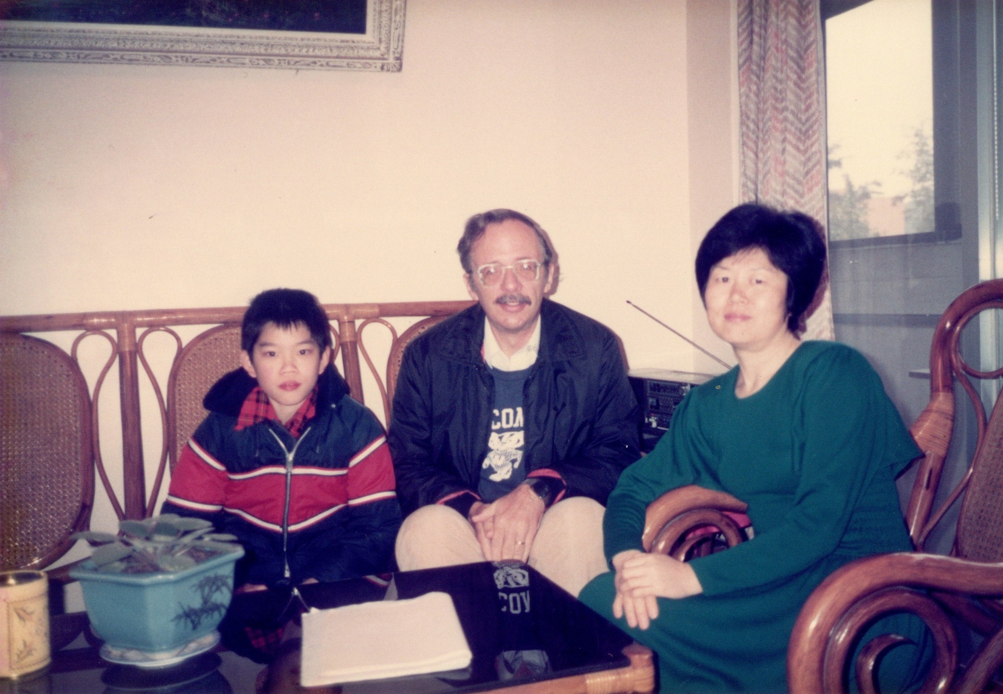 【圖1】1988年攝於李壬癸住宅,左起:李夏新、Starosta、王心玲。(照片來源:李壬癸提供)