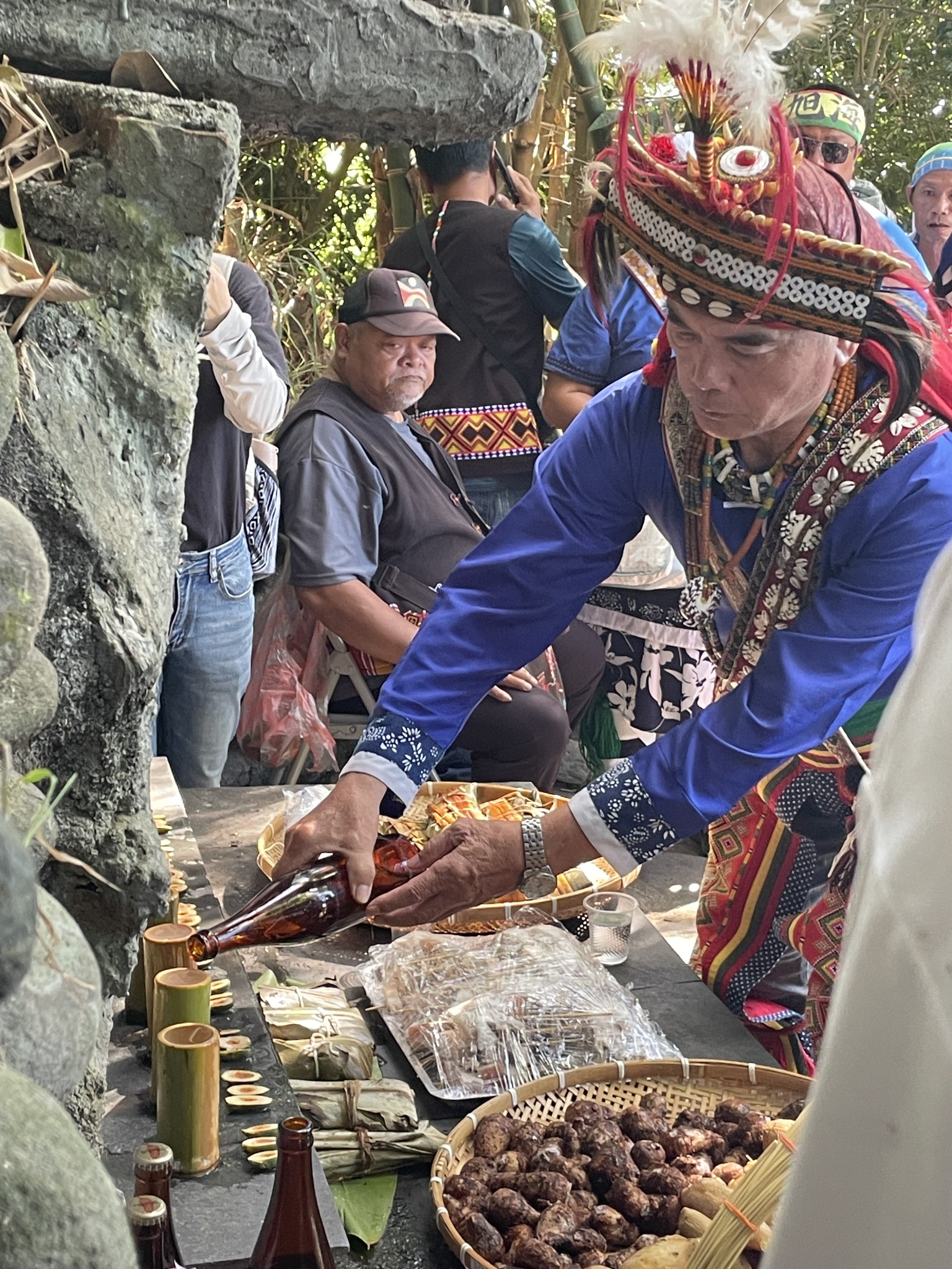 【圖1】2024年7月15日,旭海的族人到發祥地祭祀。照片中,斟酒者為潘文杰後裔潘進茂;中坐者是卡大地布Mavaliw家族司祭長林文祥(陳玉苹拍攝,2024年)