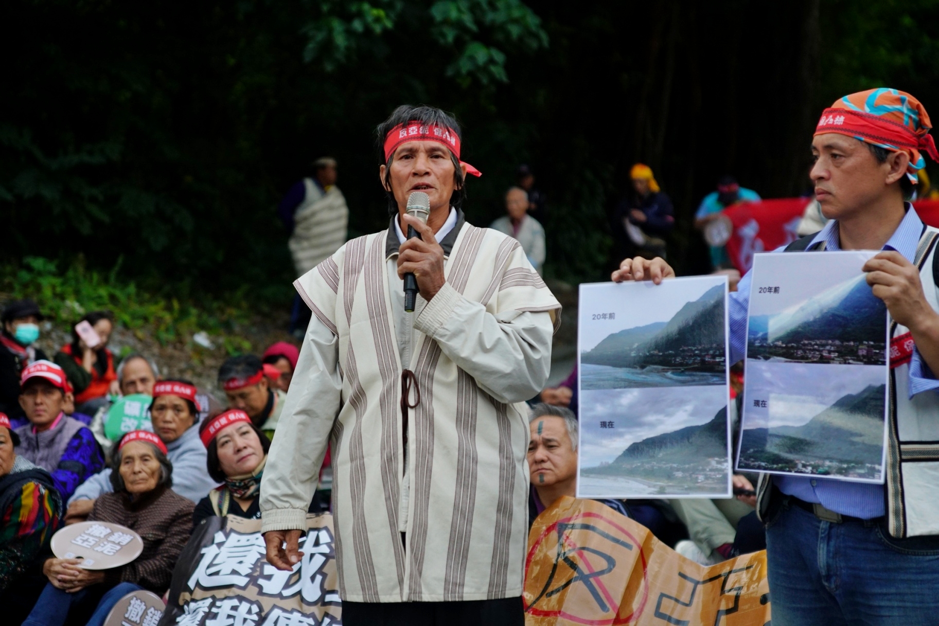 【圖2】2019年(民國108年),行政法院裁定亞泥展延案的部分程序違法,撤銷新城礦區的展延,但未全面撤銷展延許可。此判決引發族人不滿,並進一步推動土地正義運動的深化,有些族人偕同環團組織到總統府前抗議要求修法。圖為反亞泥運動核心人物Ikung sibal(田春綢)女士在還我土地抗爭中的演說實況。(Tunux Wasi提供)