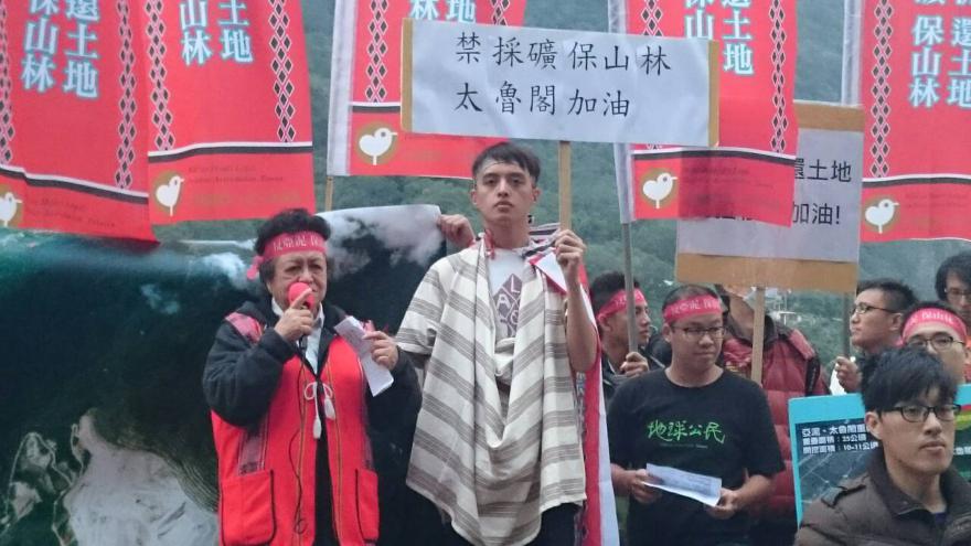 【圖1】2014年(民國103年)的太魯閣馬拉松由亞洲水泥冠名,造成當地族人不滿,遂由秀林鄉內部落族人到太魯閣閣口前的馬拉松起跑現場抗議。圖為反亞泥自救會成員與鄉內青年族人於2014年12月31日的集結抗議現場實況。(Tunux Wasi提供)