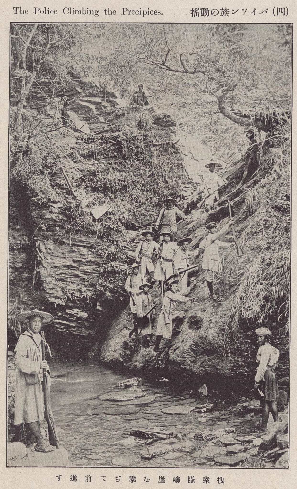 【圖1】日本搜索隊攀崖前進。(資要來源:《臺灣寫真帖》第1卷第2期(1914年),國立臺灣歷史博物館典藏(PDM))