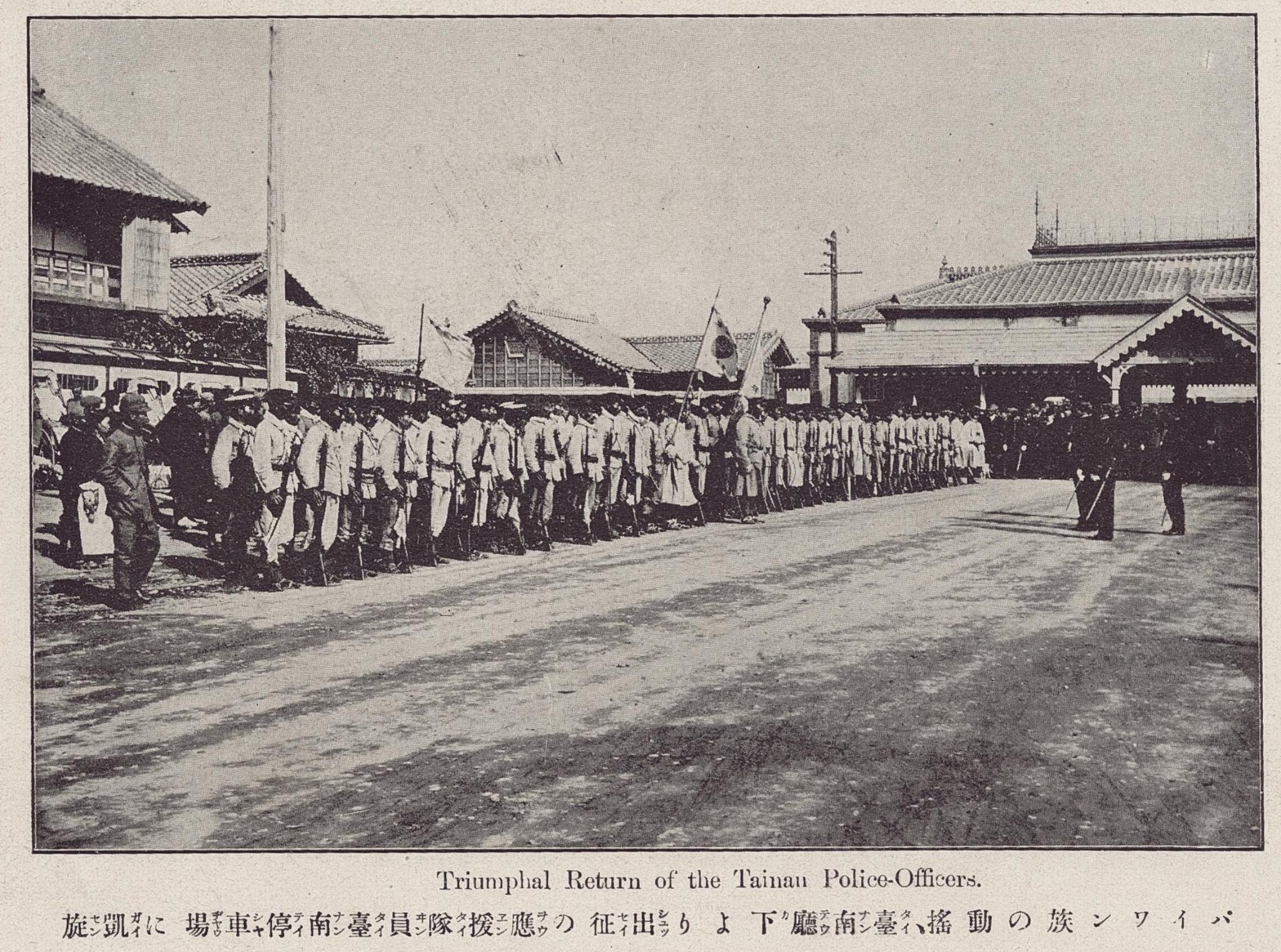 【圖3】臺南廳下出征應援隊員凱旋返抵臺南停車場。(資料來源:《臺灣寫真帖》第7期(1915年),國立臺灣歷史博物館典藏(PDM))