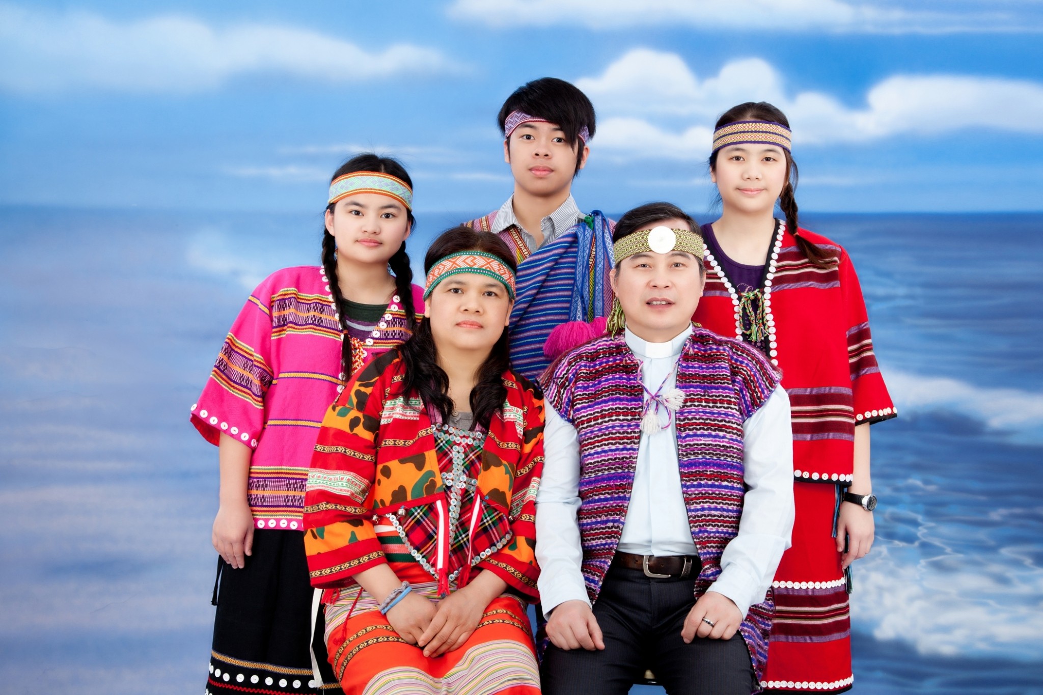 【圖二】全家福(2011年4月攝)。由左至右:(前排)妻林美英、江明清;(後排)次女江凱靈、長子江慕靈、長女江維靈。