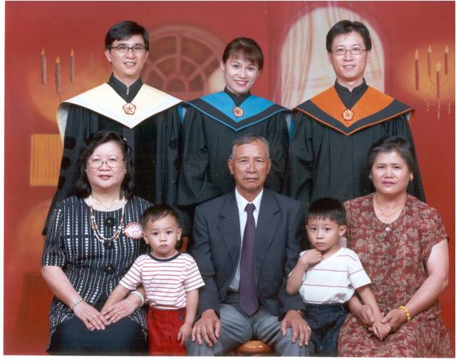 【圖9】2001年帝瓦伊‧撒耘(中排中)與長子督固‧撒耘(上排右)、長媳李秀蘭(上排中)、次子伊央‧撒耘(上排左)、長媳母林櫻花(中排右)、妻張月娥(中排左)、長孫高飛‧撒耘(下排右)、次孫耕莘‧撒耘(下排左)的全家福合影。(督固‧撒耘提供)