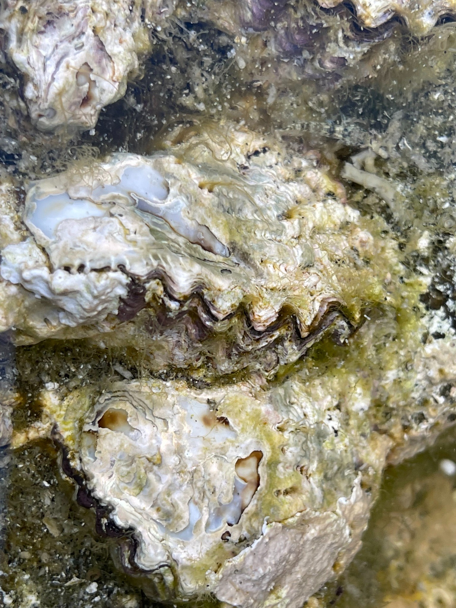 貝殼長約可達5公分,表面呈灰色,形狀不規則,以左邊的殼固著在岩石上,右殼呈蓋狀,蓋在左殼上,比右殼大,殼表呈紫褐色、黃褐色至黑色,具有粗的放射肋,生長鱗常磨損而不明顯,殼緣呈紫黑色波浪狀,相當銳利。貝殼內緣為乳白色的珍珠質,沒有刻紋殼表,韌帶區明顯,絞齒處黃棕色,閉殼肌痕呈深紫色,長圓形,大約位於貝殼的中間偏右下方處。