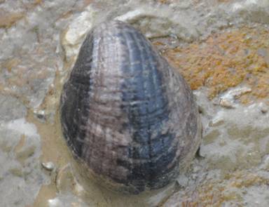 貝殼呈現半球形,螺塔低平,殼表有細螺旋紋,但縫合線淺而不明顯。殼表黑色底,有大小不一的白色雲斑或條紋,偶而有淡紅色條紋。殼口面寬平,殼口半圓形,呈白色,內唇滑層微黃,有大小不等的顆粒密布;內唇軸有三個左右的小齒另。口蓋為石灰質,呈現半圓形,內側有一鉤狀突起能強而有力地將口蓋封閉於殼口上,以防鳥類、甲殼類或其他動物的侵襲。