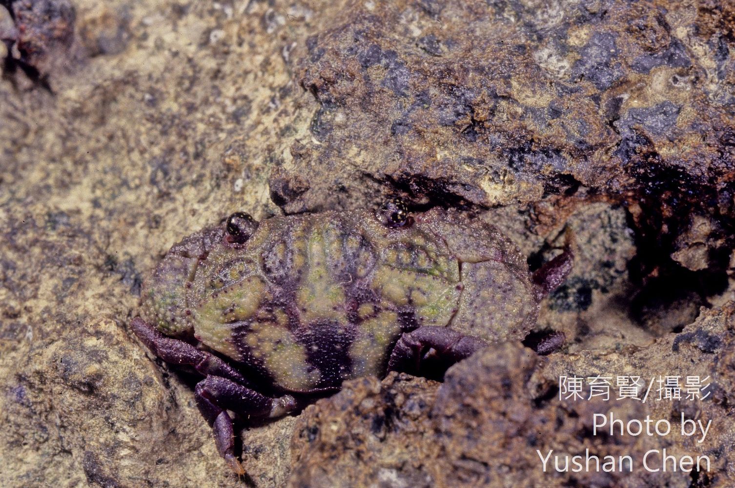 頭胸甲呈橫卵形,前三分之二分區明顯,前額分為4個結節狀的突起,甲面和螯足均密生圓形的顆粒和很短的硬剛毛,螯腳掌部外側的顆粒較大。螯腳粗壯,左右不等大,大螯腳的可動指基部有一彎曲的大齒;小螯腳的鉗指彎曲,步腳的顆粒很細小。身體呈咖啡色、暗紫色志黑褐色,有些小個體有大片棕綠色的斑紋,螯腳的指尖及各附肢的關節顏色較淺,身體的顆粒和角膜有淡色的細點。