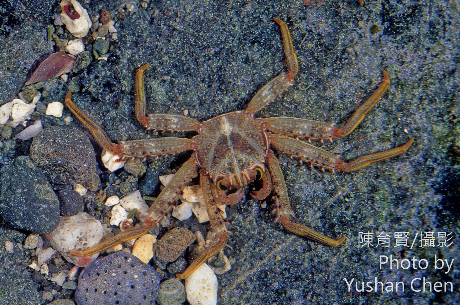 頭胸甲約4公分,身型扁平,前額具4齒,頭胸甲及腹面為黑褐色、褐色、棕褐色或灰褐色,前緣及側緣有黃綠色之條紋,中央有1條縱向的黃綠色條紋,縱紋兩側有對稱的黃色斜紋,形成2個V字,有如盾牌。