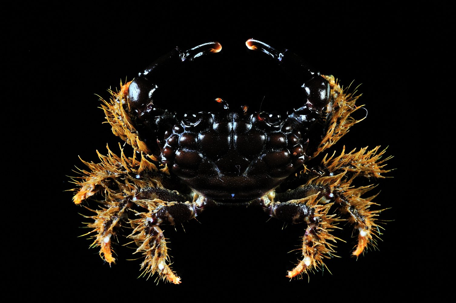 頭胸甲呈卵圓形,甲中及前部有表面光滑大小不一的疣狀突起。整體為漸層的深褐色,體色由螯向甲身以至第四步足而漸淡。步足長有黃色剛毛。