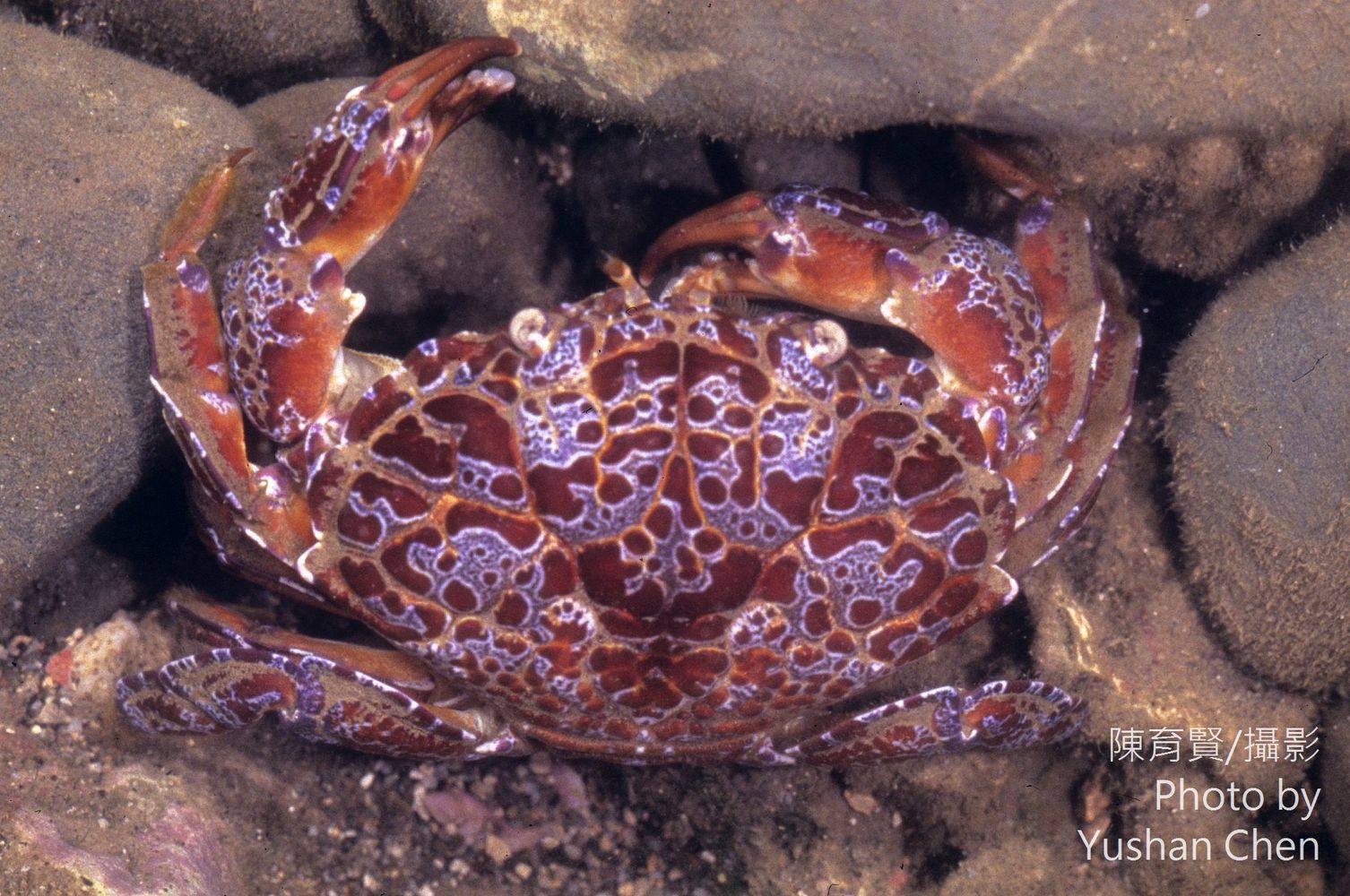 頭胸甲寬約10公分,呈橫橢圓形,長寬比約3:2,表面平滑有光澤,具有許多隆起和深溝,眼窩小,內角呈鈍齒狀。螯腳的大小左右相同,腕節和掌部粗糙,上緣有隆起的稜,手指粗壯,在內側緣具有粗壯的齒,指節末端呈匙狀。步腳寬扁,各節上緣均有隆起的稜,呈刀鋒狀,內側面有剛毛,指節粗短,密被剛毛。身體呈橘黃色、褐色、紅褐色,有淡紫色至淡藍色的泡沫狀網紋。