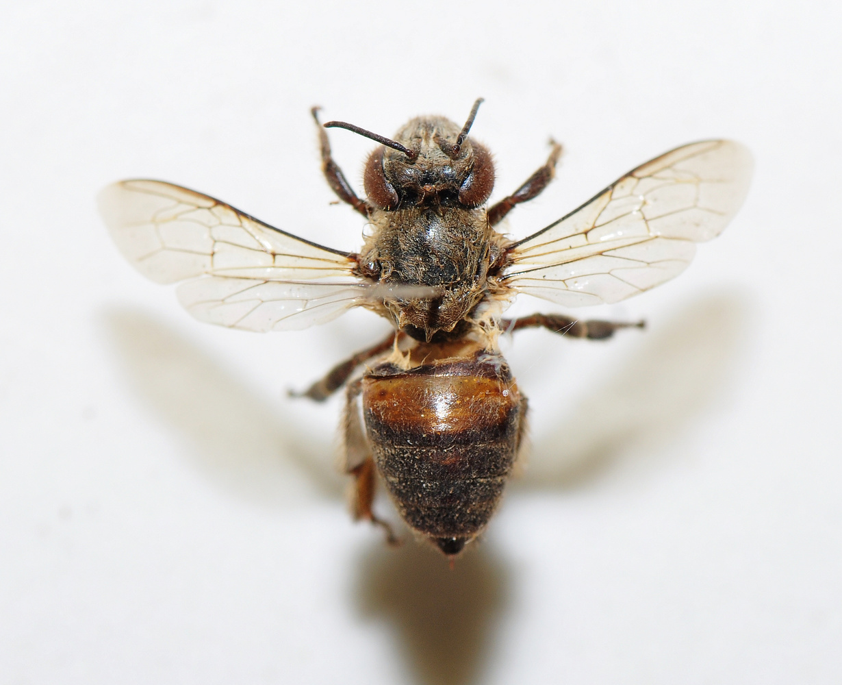 體毛多,腹部體節偏黑褐色,頭盾基部具三角形黃斑,後足黑色,翅長小於9公釐,穴居物種。