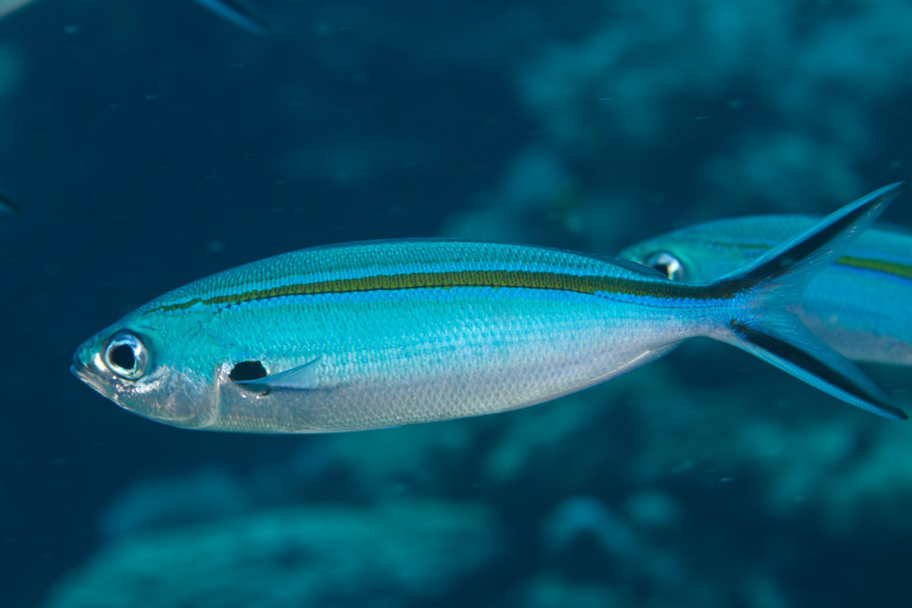 最大體長為35公分,體呈長紡錘形。上頜骨具有伸縮性,且前上頜骨具一個指狀突起。體被中小型櫛鱗,側線完全且近於平直。體背藍色,腹面銀白或淡或帶紅色光澤。體側具一條金黃色縱帶。胸鰭基部具黑色斑塊;尾鰭上下葉各具一條黑色縱帶。