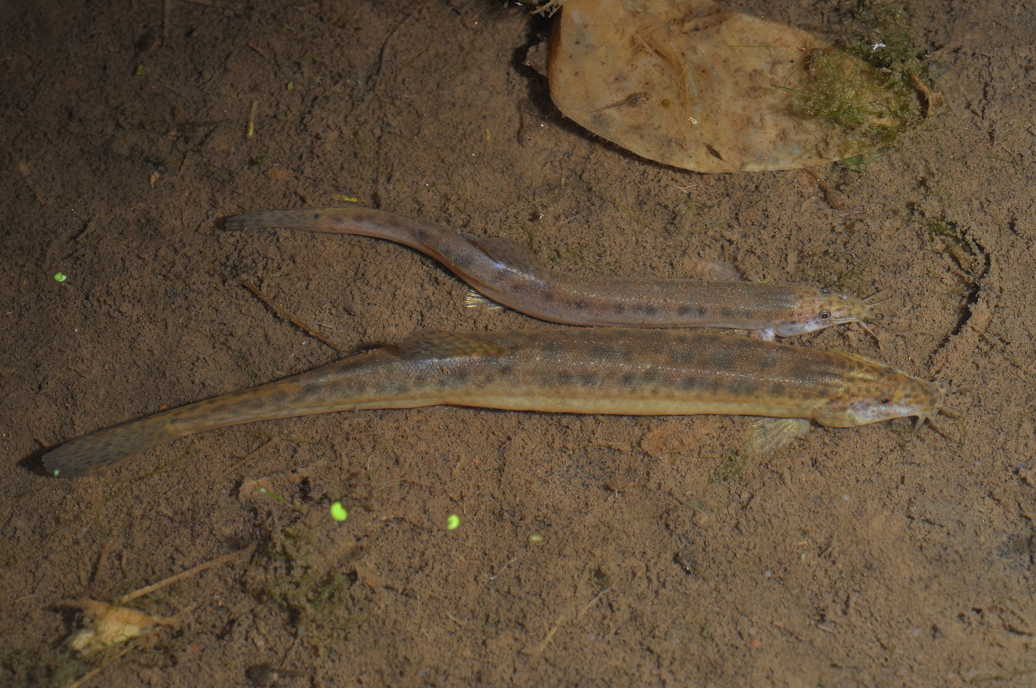 體延長,前段略為圓筒形,後部側扁,腹部圓形,背緣線平直;尾柄有皮質隆起而與尾鰭相連。頭部稍側扁,近似圓錐形。吻突出而稍圓鈍。眼小,口小,呈馬蹄形。鬚5對,吻鬚2對,口角鬚1對,頦鬚2對。體被細小圓鱗,頭部無鱗;側線不明顯,各鰭均無硬棘,尾鰭圓形。體背側灰褐色,腹側為淡黃色,全身布滿黑褐色小點;背鰭、臀鰭及尾鰭密布細小的黑色斑點;尾鰭基部上方具有一明顯黑點。
