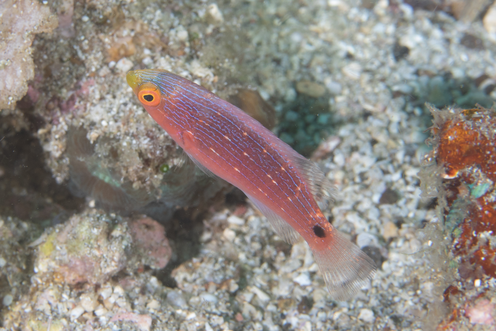最大體長為13公分,體延長而側扁。背鰭前中央鱗5枚;吻部與眼間隔處無鱗;側線不連續,尾鰭尖型。體黑褐色,腹部色淡;腹鰭與尾鰭黑褐色;胸鰭透明,腋下稍黃;背鰭黑褐色,鰭緣黑色,鰭中央具一紅帶,向前漸細而消失;臀鰭紅色,基部灰色,後方鰭緣黑色。