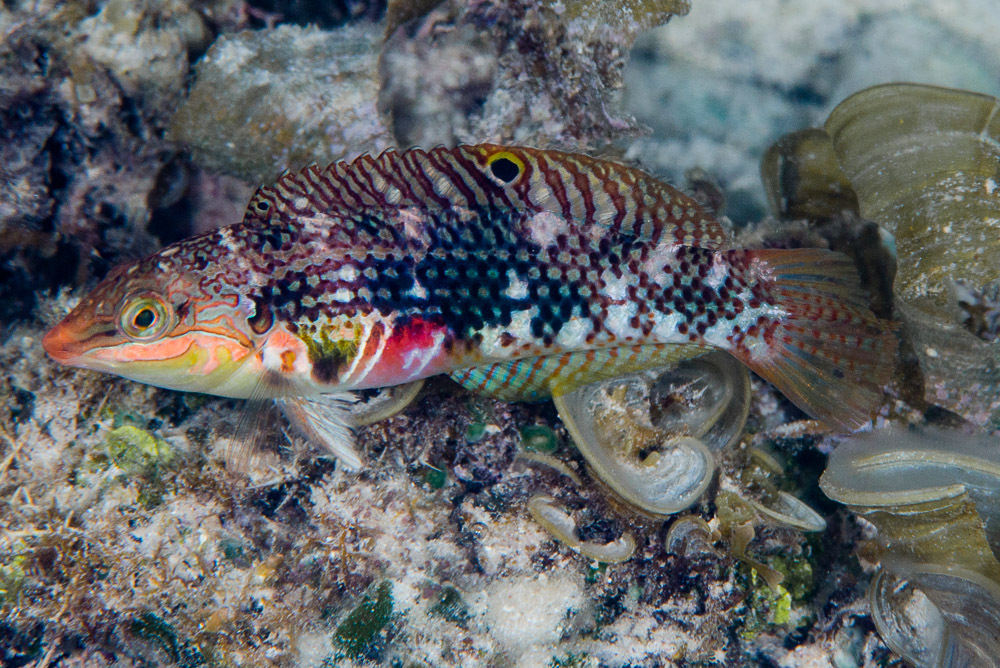 最大體長為12.5公分,體延長且側扁。吻較長,尖突,前鼻孔具短管。體被中大圓鱗,側線完全。雌魚體上半部橄欖綠色,鱗片具黑緣,腹部色淡,具大小不一的白斑,腹部後緣具一大的粉紅斑,眼後具一小黑斑,前方背鰭具一小黑點,背鰭中央具一鑲黃邊的黑斑。雄魚綠色具紅褐色點,色點偶而相連形成橫帶,頭部綠色,眼前具二條平形的紅縱紋,眼後具二條放射狀的紅紋,眼下方具一水平的長紅紋,鰓蓋後下緣至峽部淡粉紅色,背鰭紅色具排列不規則的綠斑點,背鰭中央亦具一黑斑,臀鰭紅色,中央具一縱列的綠斑。