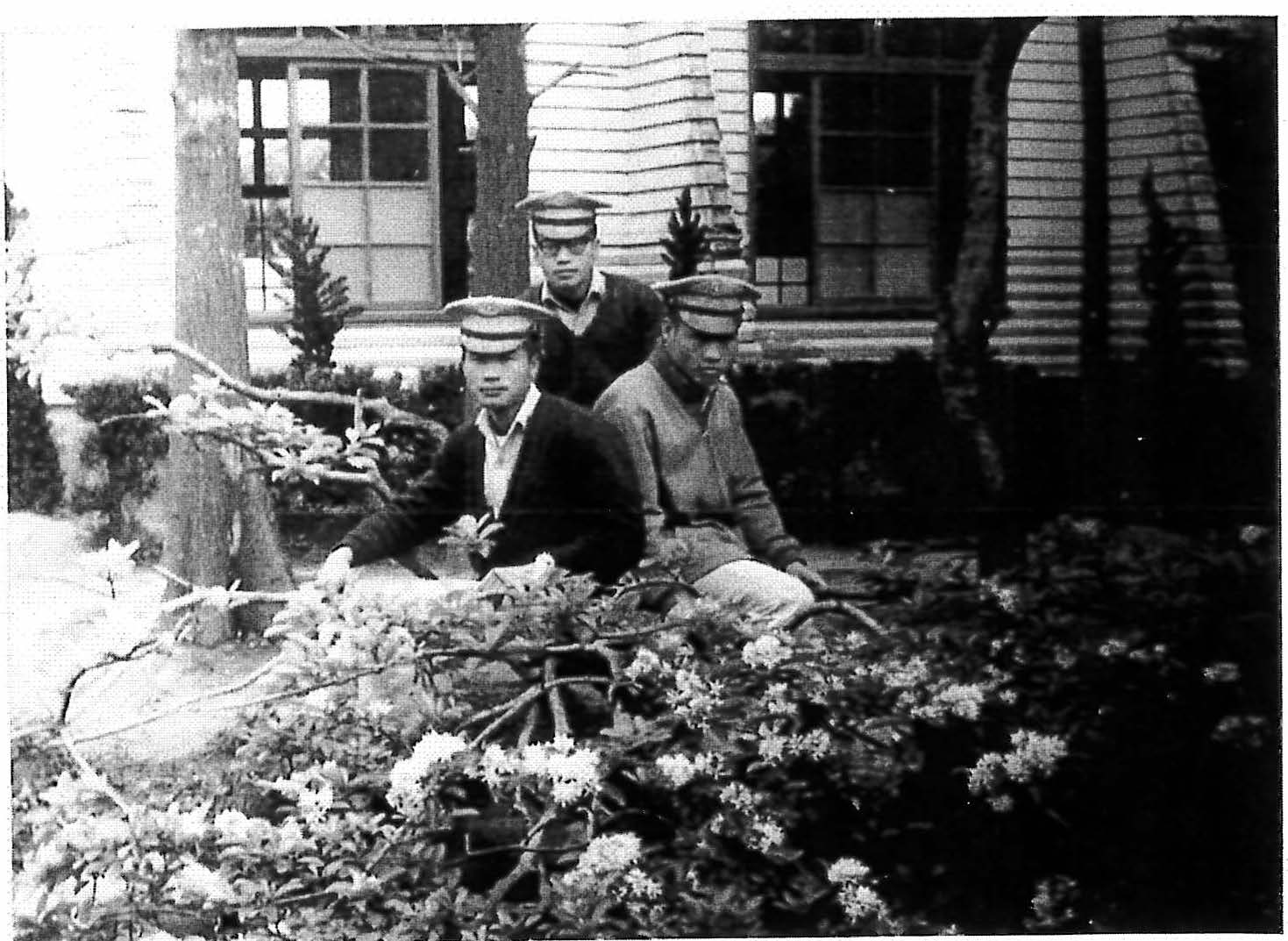 【圖一】17歲,(1961年,民國50年)趙正貴(後中左者)就讀台灣省立桃園農校綜合農業科,和同學彭武男(右)、彭信朋(左)在學校禮堂旁的合照。背景為日據時期建的木製教堂。