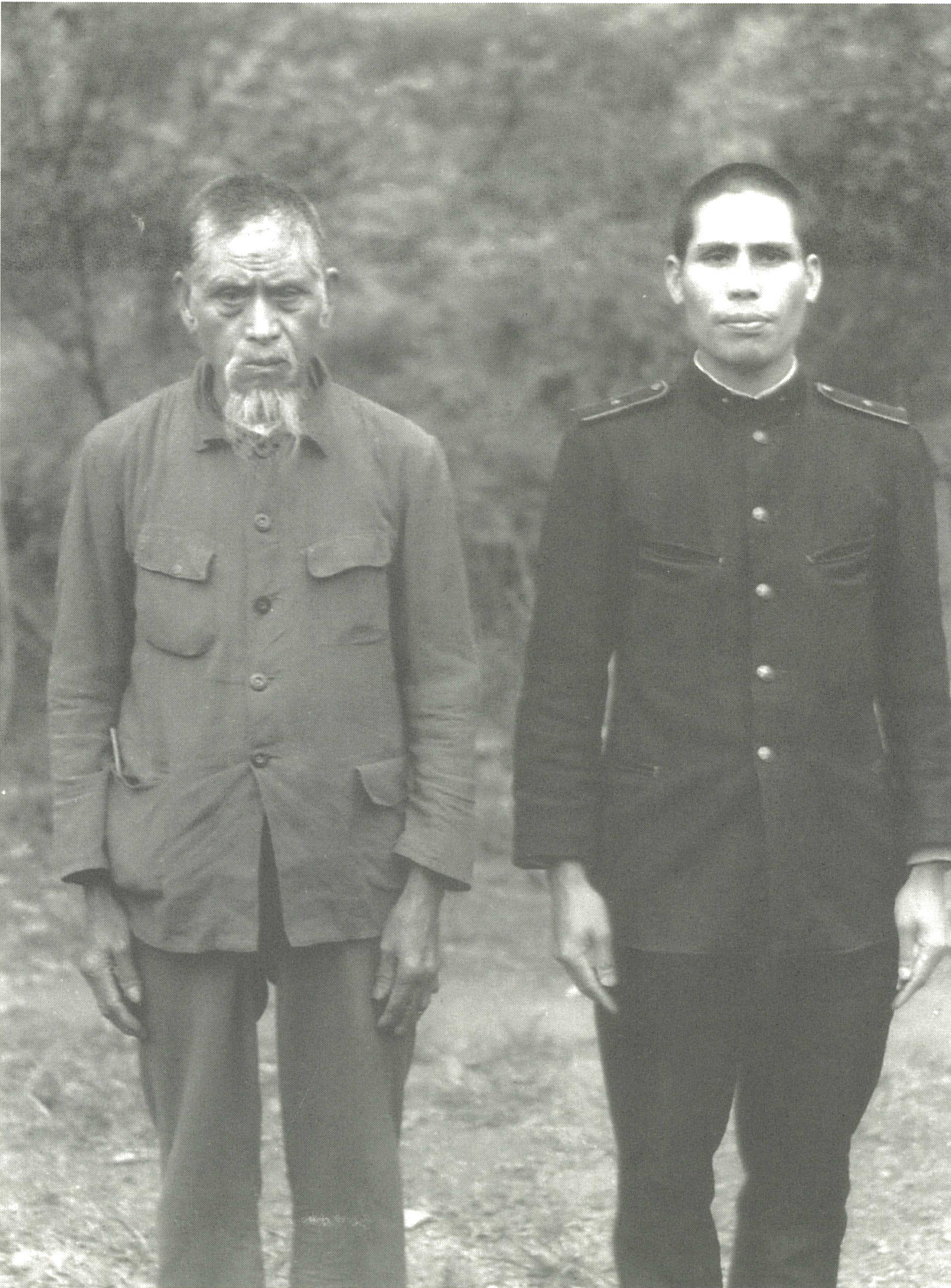 【圖一】73歲,(1943年,昭和18年)3月18日,Taro’ a ’Oemaw(伊波幸太郎,趙明政)和36歲次子’Oebay a Taro’(伊波仁太郎,趙旺華)合照於十八兒警察駐在所(現新竹縣五峰分駐所)。