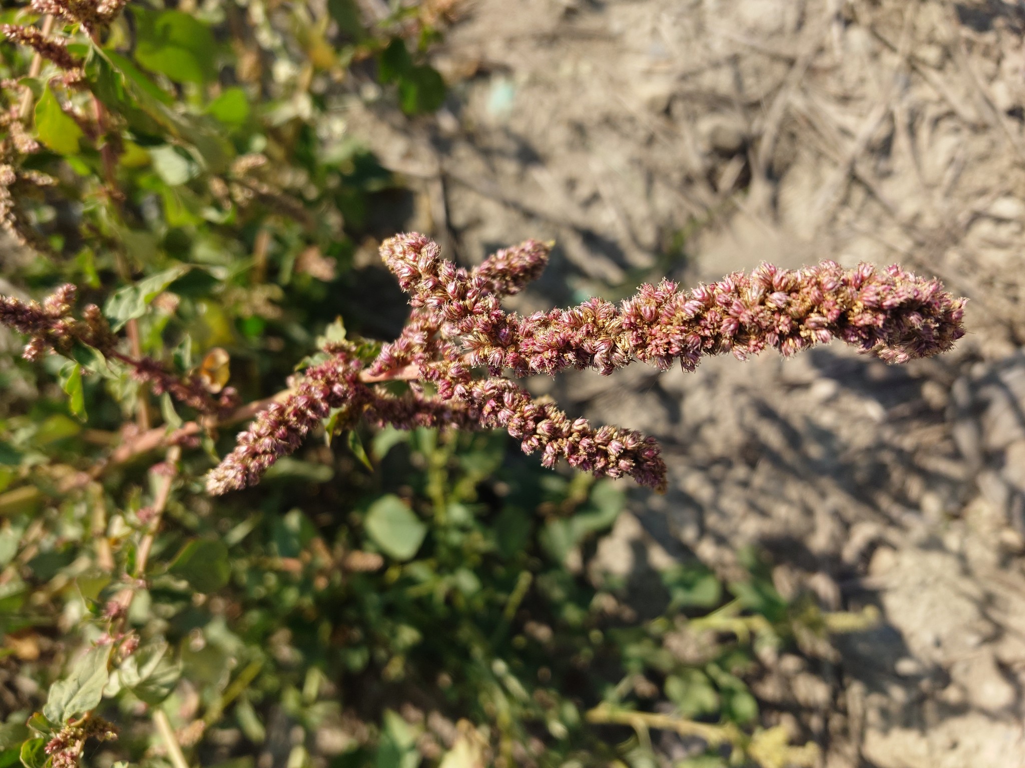 一年生草本,株高40-100公分。全株光滑無毛。莖直立,分枝綠色有時帶紫色。單葉互生,具柄,時帶紅色,卵形至卵狀橢圓形,長3-9公分,寬2.5-6公分,基部寬楔形或近截形,全緣或微波狀緣。腋生或頂生穗狀花序,花小密集,先端有芒。胞果扁球形,徑約0.2公分,黃綠色,成熟時不開裂,皺縮,果期8-10月。種子球形,徑約0.1公分,黑色。