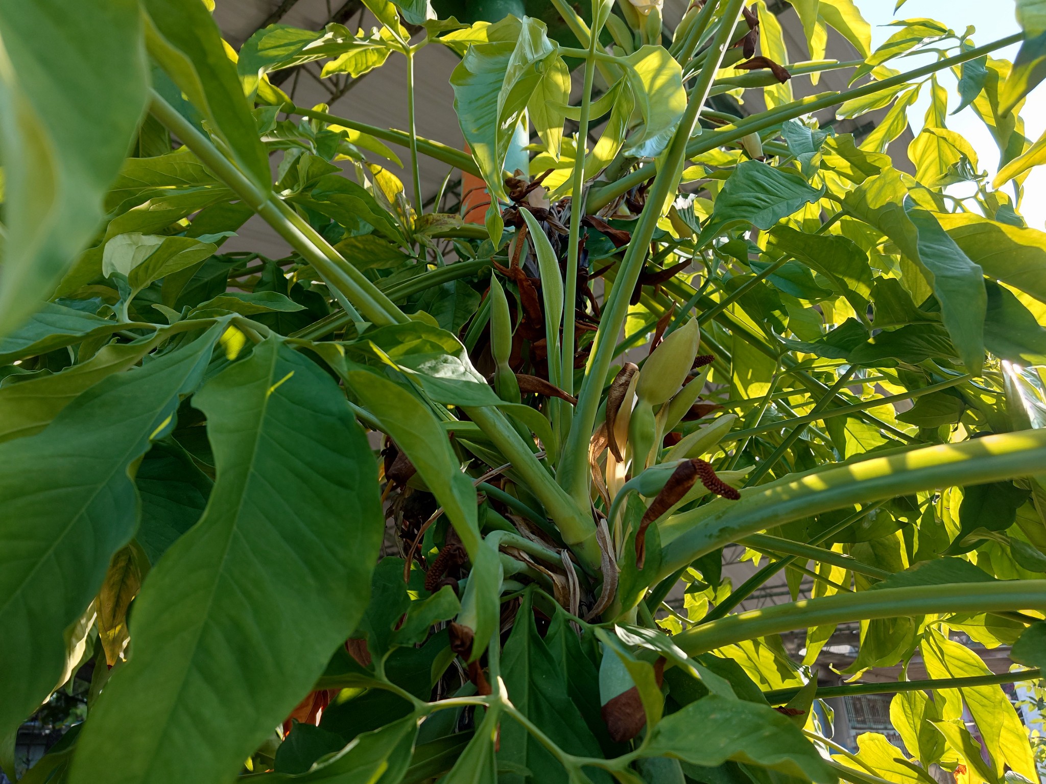 攀緣藤本。莖四方形,粗2.5-4公分。葉一回羽狀深裂,卵狀橢圓形,長30-50公分,寬20-35公分,先端漸尖,葉基近心形,葉片兩側約12-13對裂片,裂片狹披針形,偶鐮刀形,葉先端裂片常近菱形,葉柄長10-30公分。佛焰花序,花梗長10-15公分,佛焰苞卵形,長10-12公分,肉穗花序,花兩性,無柄,圓柱狀,長10-15公分,花柱粗圓柱狀,柱頭橢圓形,徑約5公釐。種子腎形,淺黃色。