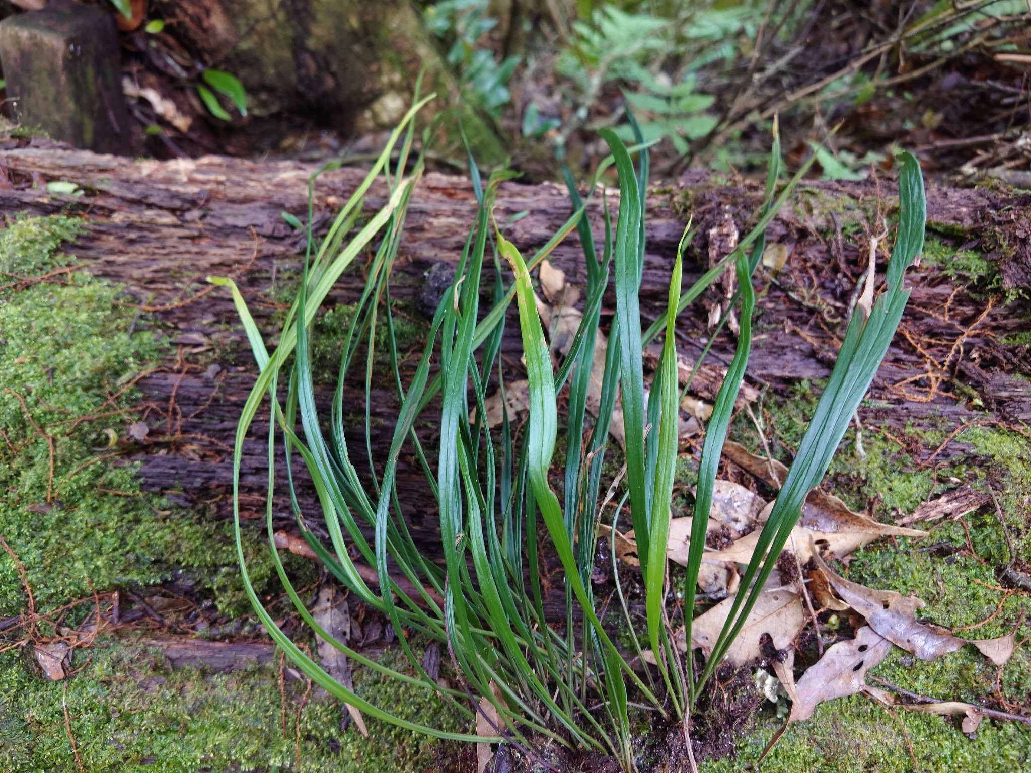 多年生草本植物,具膨大地下走莖,長可達19公分,株高約9-11公分,莖極短。葉叢生,狹線形,長9-19公分,寬0.1-0.4公分,葉上表面光滑,墨綠色,葉下表面具白色氣孔帶。總狀花序,花9-11枚,花冠淡紫色至白色,具小花梗,花被片6枚。核果徑約0.4公分,藍紫色。