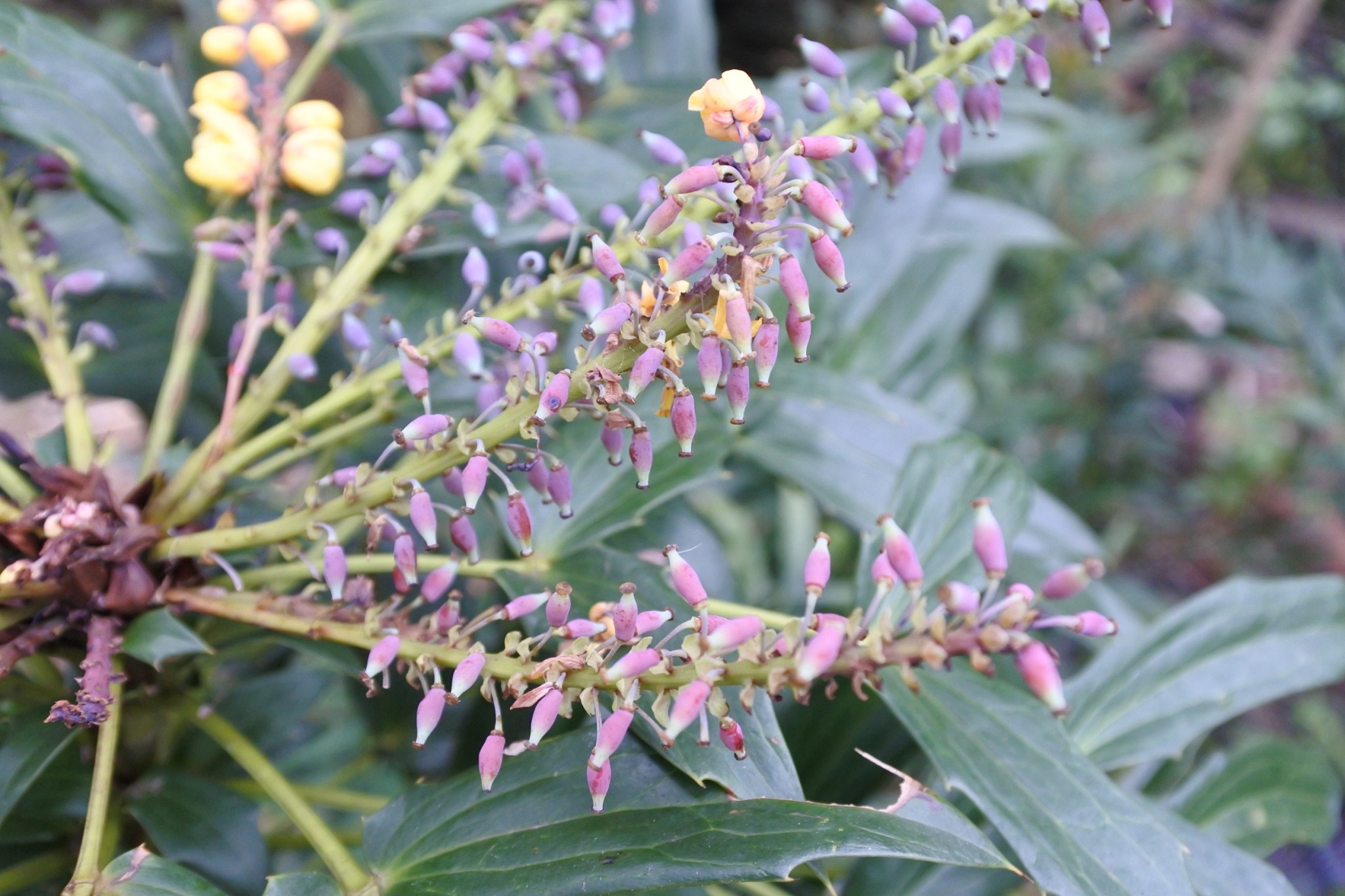 常綠小灌木,株高2.5公尺。一回羽狀複葉,叢生於枝端,小葉12枚,葉革質,葉基歪斜,長橢圓形或卵狀披針形,長約5公分,寬約3公分,具4、5枚齒牙狀鋸齒。總狀花序頂生,長9-19公分,萼片3輪,共9枚,花冠黃色,花瓣6枚,雌蕊6枚,雄蕊1枚。漿果卵圓形,紫黑色,長0.7-0.9公分,肉質,種子多數。