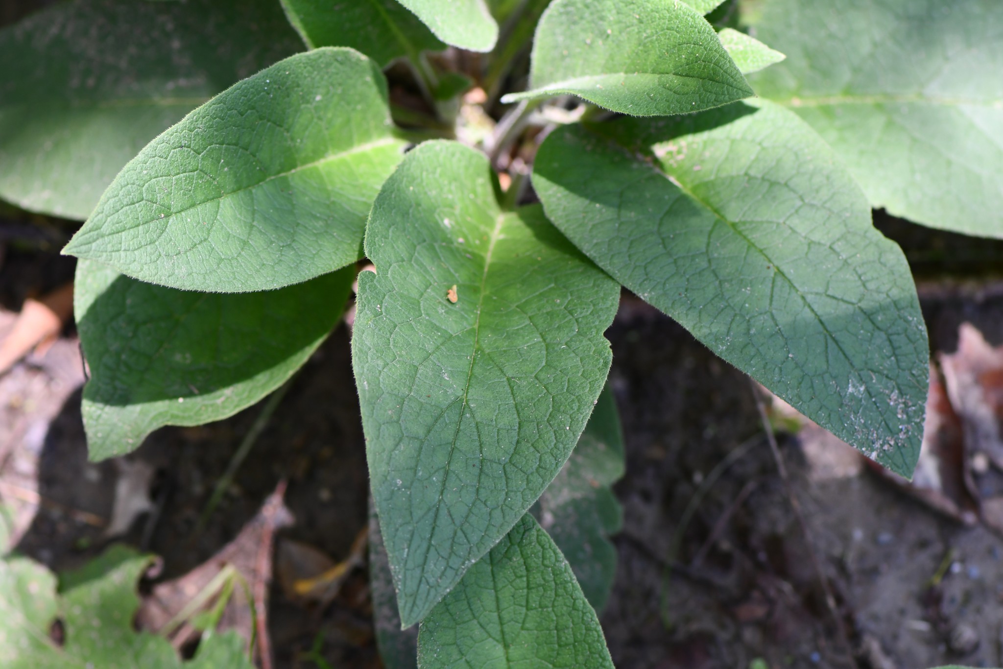 多年草本,株高約50-100公分,全株布滿白色粗毛,莖具稜翼。單葉互生,葉片卵狀披針形,長約25-45公分,寬約8-11公分,葉柄上部呈翼狀。卷繖花序,花白、黃,或紫色,花冠廣筒形,先端5裂,具有5裂的萼片及5枚的雄蕊。果爲四分果,分果卵形。