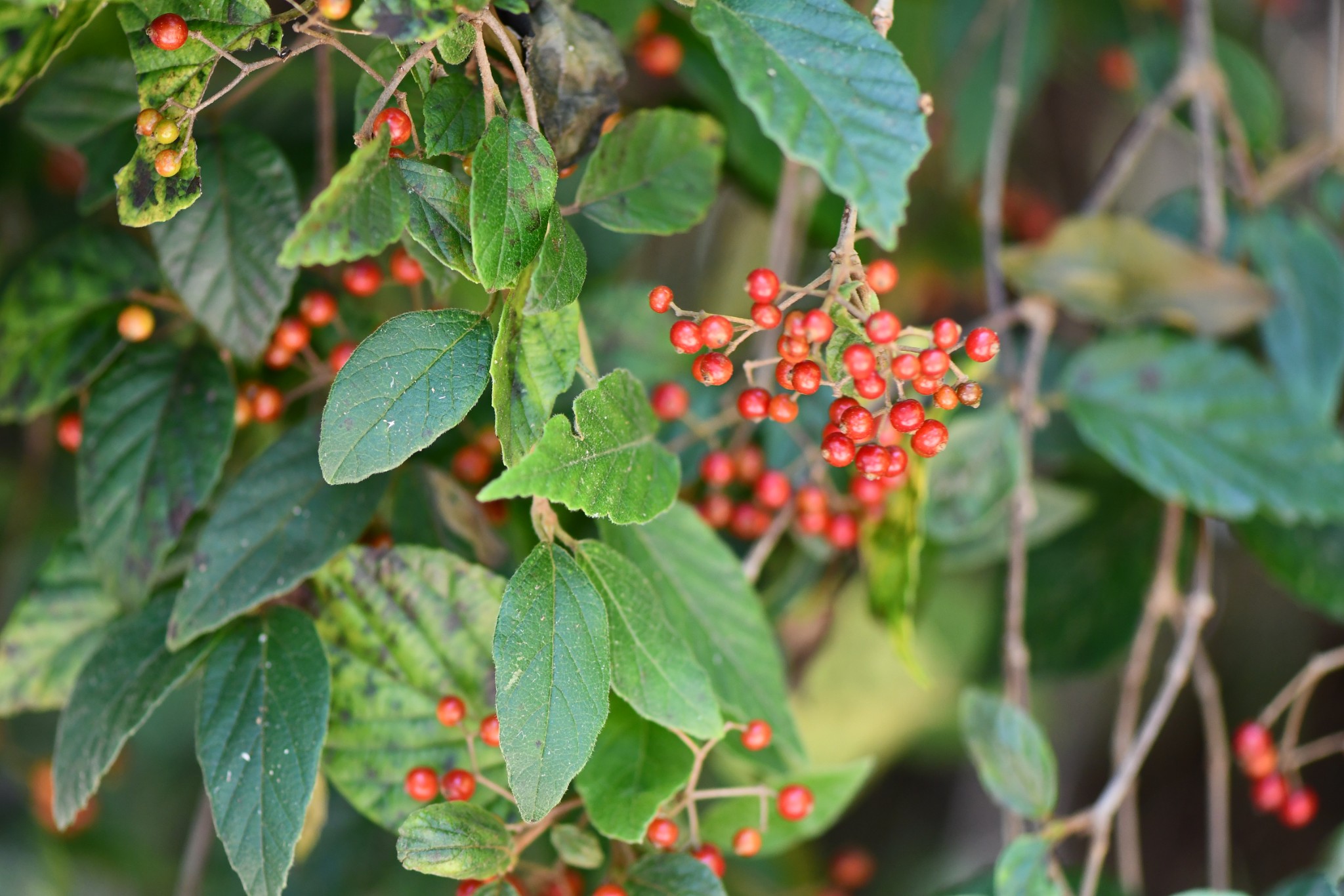 灌木至小型喬木。小枝被褐色星狀毛。葉對生,卵形至卵狀披針形,長3-9公分,寬2-5公分,先端漸尖,鋸齒緣,葉背被星狀毛,紙質。頂生聚繖花序,花序被鏽色絨毛,花冠白色,多數,花萼5裂,雄蕊5枚,明顯挺出花冠。球形核果,成熟轉鮮紅,種子具稜。