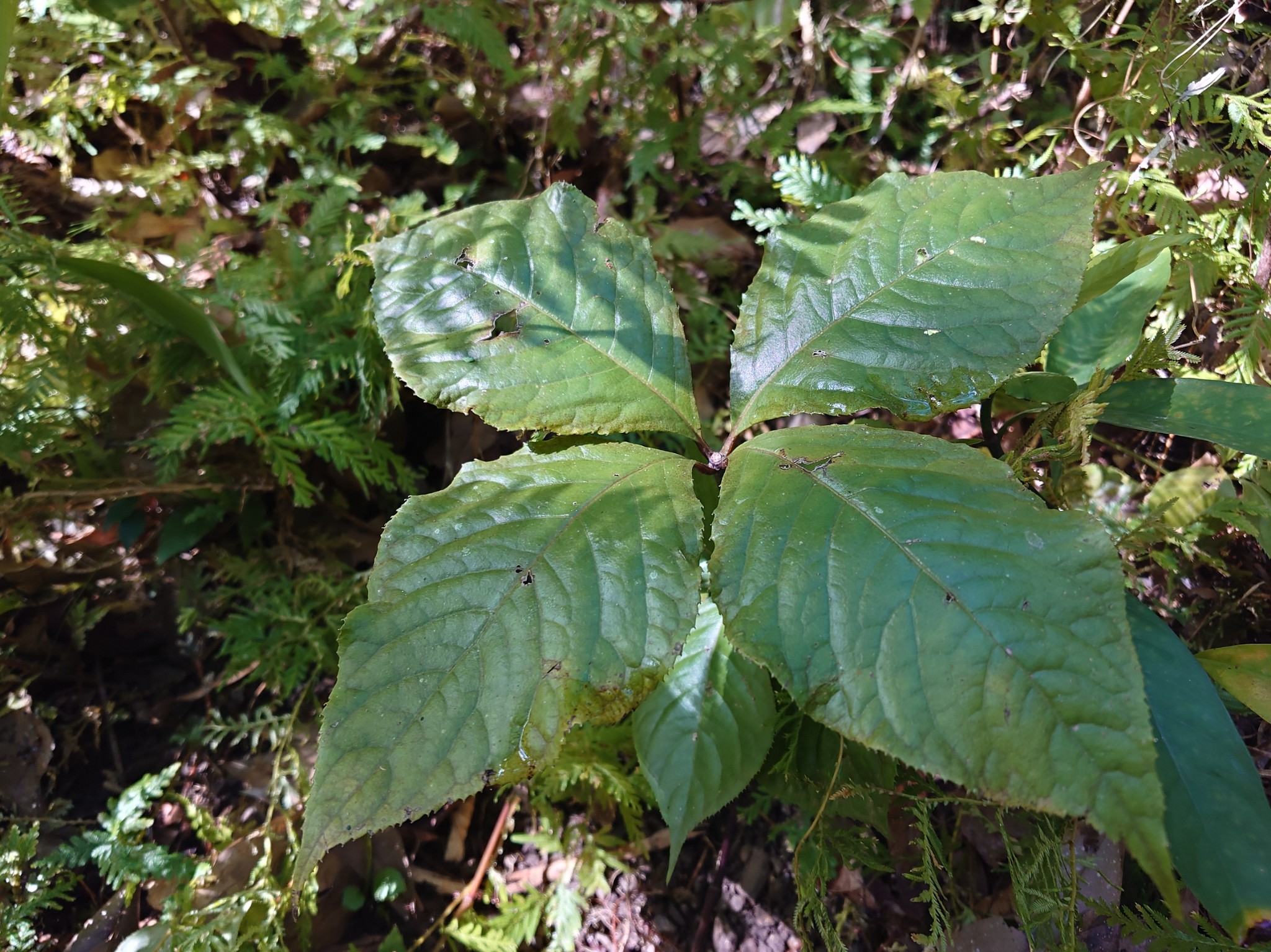 多年生草本,株高30-50公分,根多數,莖節明顯。葉頂生莖端,十字輪生,節間極短,具短葉柄,紙質,光滑,廣卵形,長6-15公分,寬4-8公分,先端尖,葉基楔形,細鋸齒緣。穗狀花序頂端2-3枚簇生,花多數,細小,無花被,雄蕊白色,雌蕊綠色。核果小球形。花果期春、夏季。