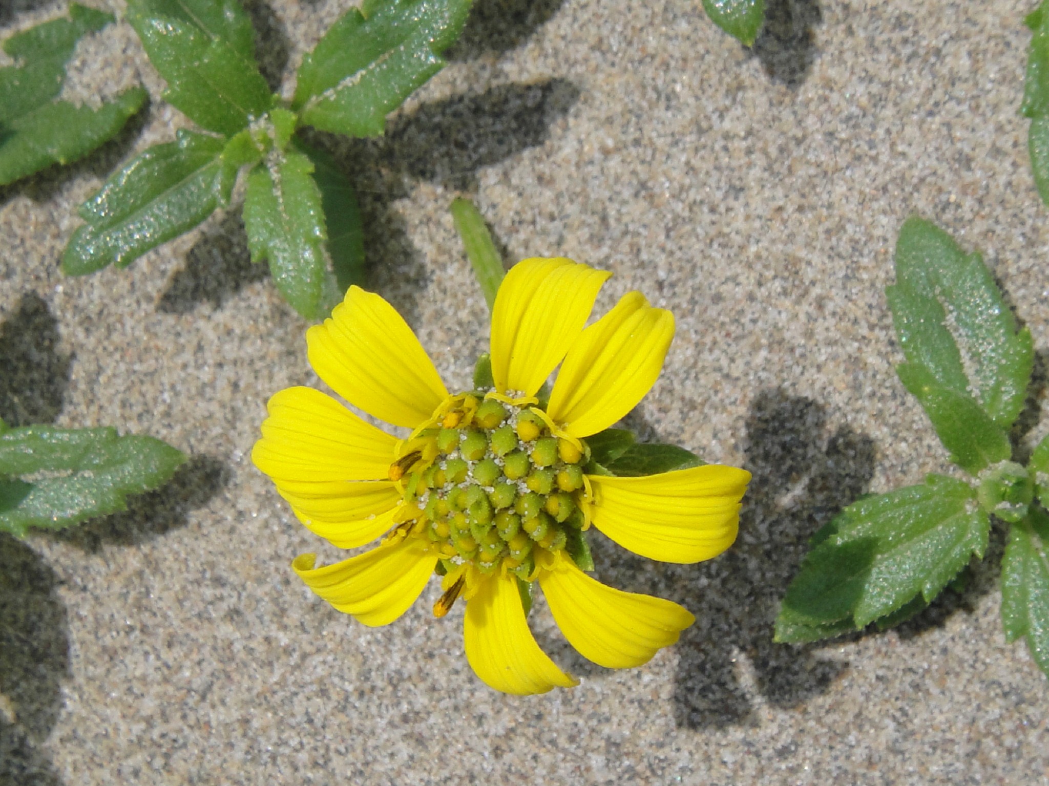 多年生匍匐草本,全株被硬直毛。單葉對生,無柄,葉倒披針形、線狀長橢圓形,長3-7公分,寬0.6-1.2公分,先端尖,全緣或疏鋸齒緣。頭狀花序,腋生,具長梗,總苞半球形,頭花黃色,周圍為舌狀花,兩性,中央為管狀花,雌性。瘦果倒卵形,3稜,長約0.35公分。花果期春至秋天。