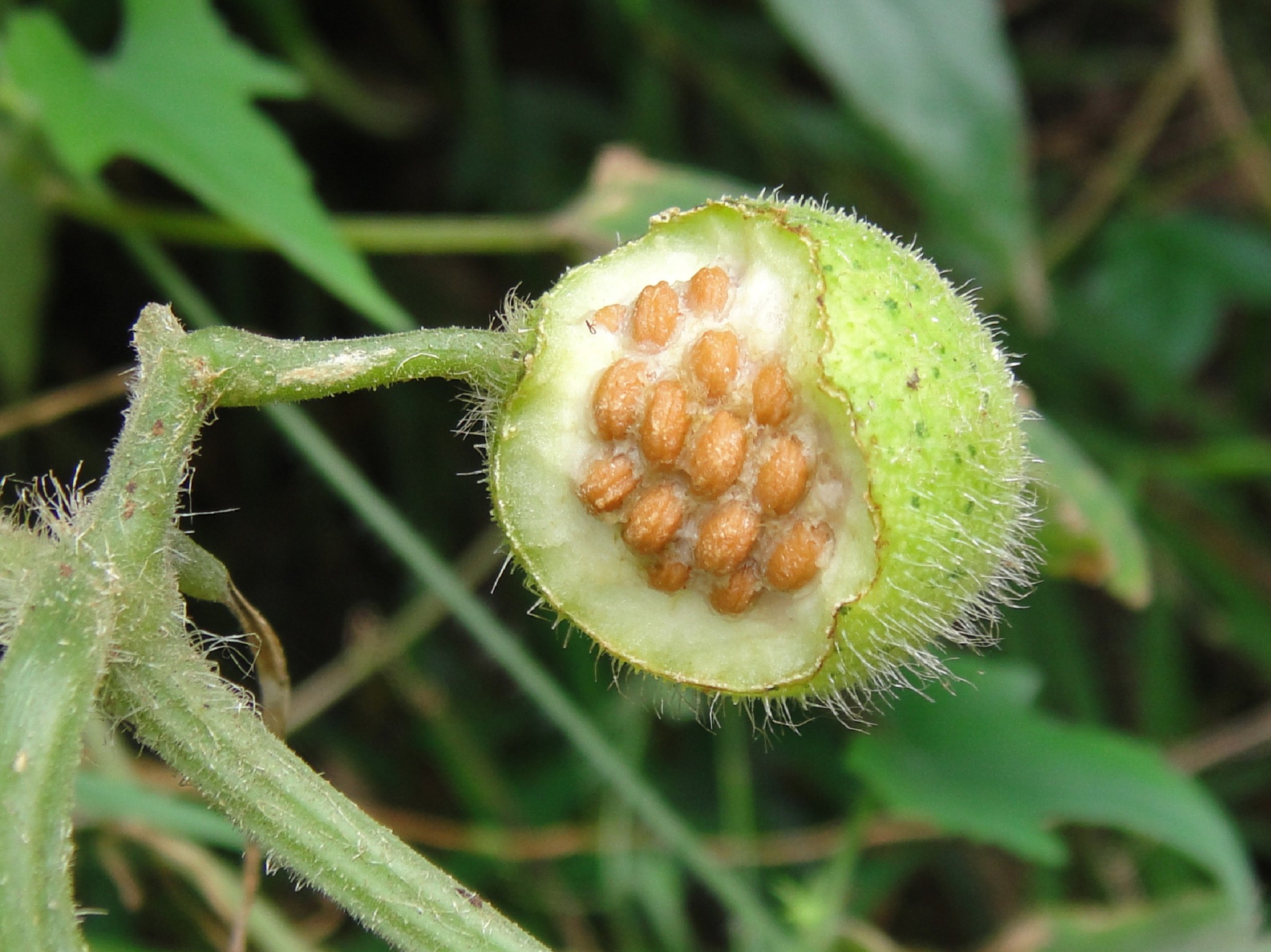 多年生宿根性草質藤本,具塊根,全株密生毛,卷鬚分叉,細長。葉互生,具長柄,葉心臟形,先端尖,葉基心形,不整狀波齒緣,葉被絨毛。雌雄異株,花單性,雄花總狀花序,花萼5裂,花冠鐘形,黃色,深5裂,雄蕊5枚,雌花單生,子房下位,球形,3室,花柱3歧,柱頭2淺裂。果實球形,被細毛,成熟時紅色。花果期夏、秋間。