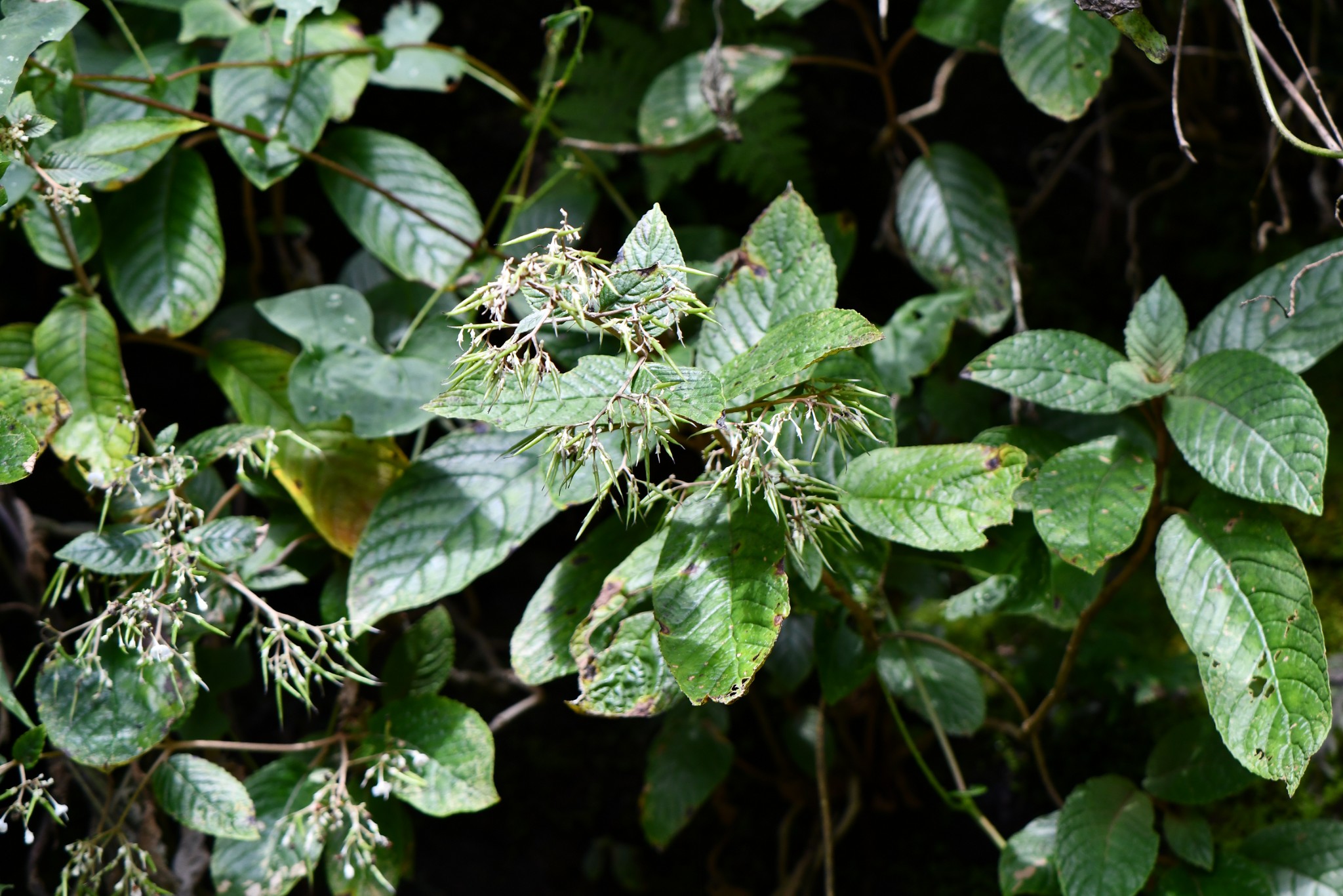 小型灌木。莖密被褐色毛。單葉對生,長橢圓狀披針形至倒披針形,鋸齒緣,厚紙質,葉被密被棉毛,呈褐色。頂生或腋生圓錐狀具繖花序, 花萼5裂,裂片線狀至長橢圓形,花冠筒狀,白色。線形蒴果,先端尖,成熟時開裂,螺旋狀旋轉。