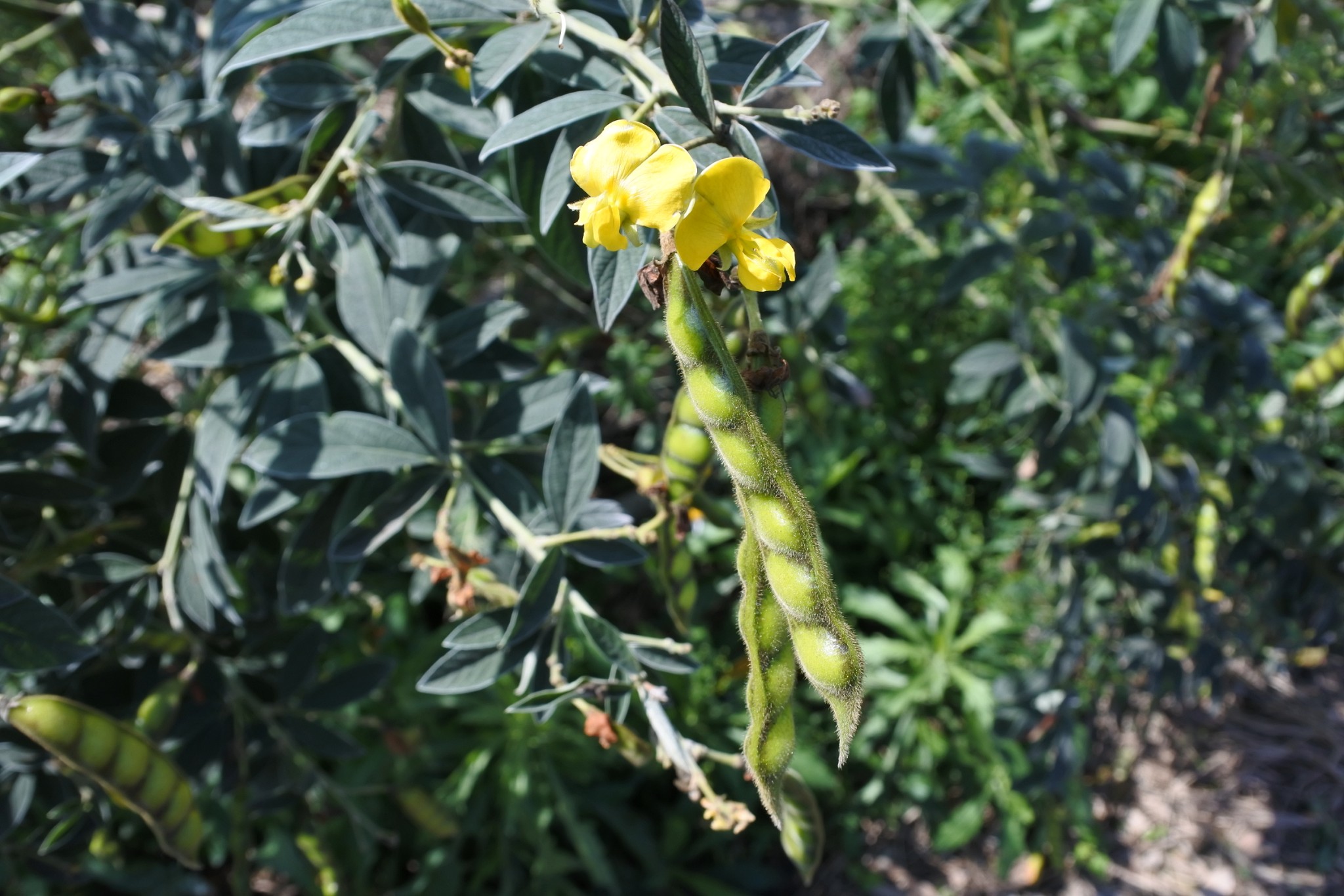 直立灌木。高1.5-2公尺。全株被毛,分枝多,老莖光滑。三出複葉,小葉披針形,長2-10公分,先端漸尖,葉背具腺點。腋生總狀花序,黃色蝶形花冠,旗瓣近圓形,基部有1對附屬體,龍骨瓣內曲,二體雄蕊(9+1),花萼鐘形,花期2-11月。線形莢果,略鐮刀狀,先端漸尖,長3-7公分,兩面密生絨毛。種子5-7枚,圓形,一側略扁平,深褐色至深紅色,種臍白色。