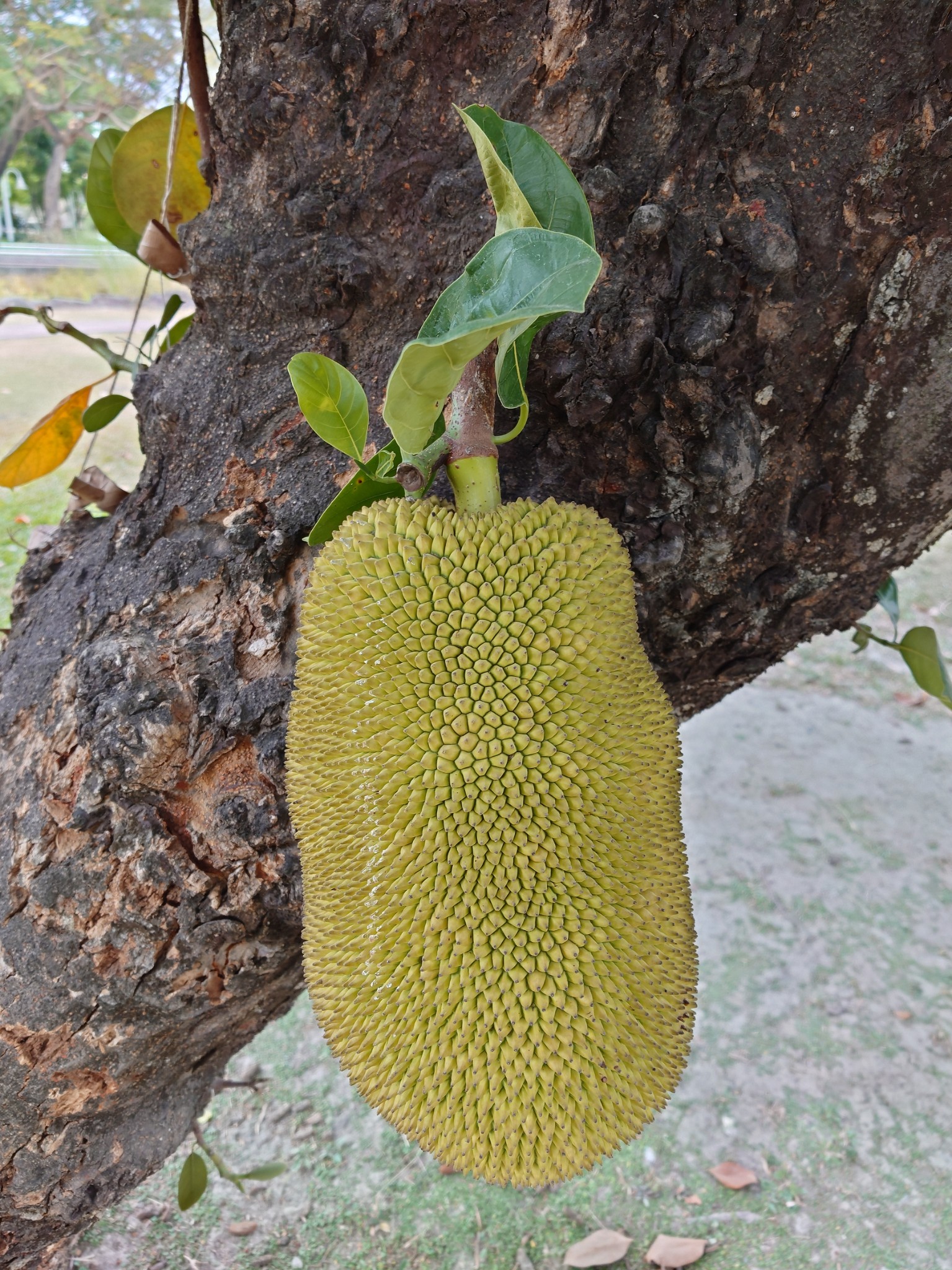常綠喬木,株高約10-20公尺,全株具有乳汁,樹皮灰褐色。單葉互生,葉濃綠色,全緣,長卵形、倒卵形或長圓形,長約9-16公分,葉革質,葉面具光澤,托葉早落。雌雄同株異花序,幹生花,花單性,花序肉質。複合果卵狀橢圓形,表皮有六角形龜狀突起,重約9-16公斤,果肉白色富含香氣,內含種子約50-170粒。花期春、夏兩季。果期夏、秋兩季。