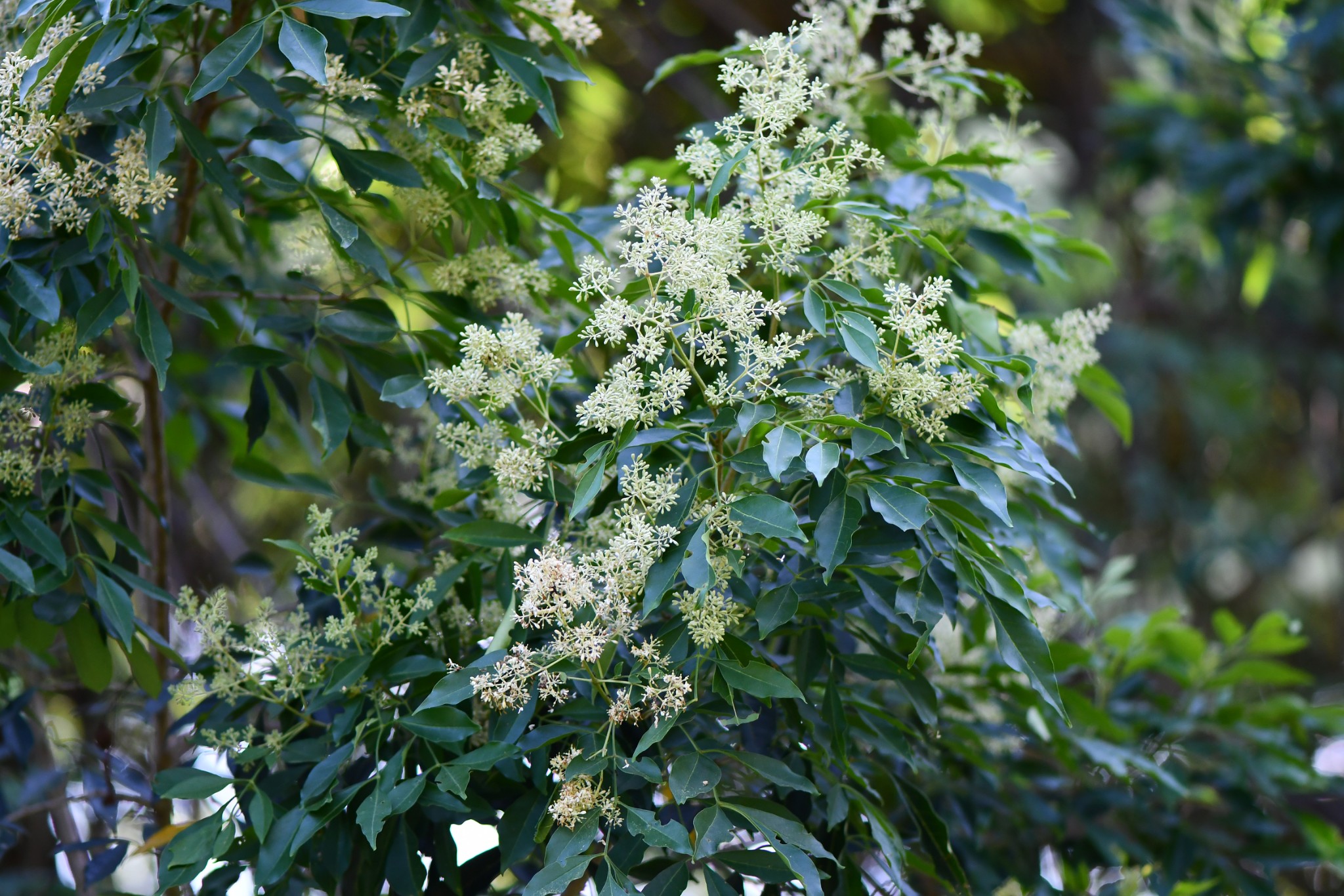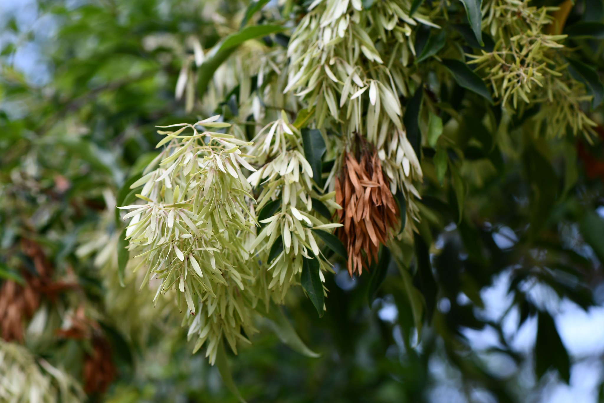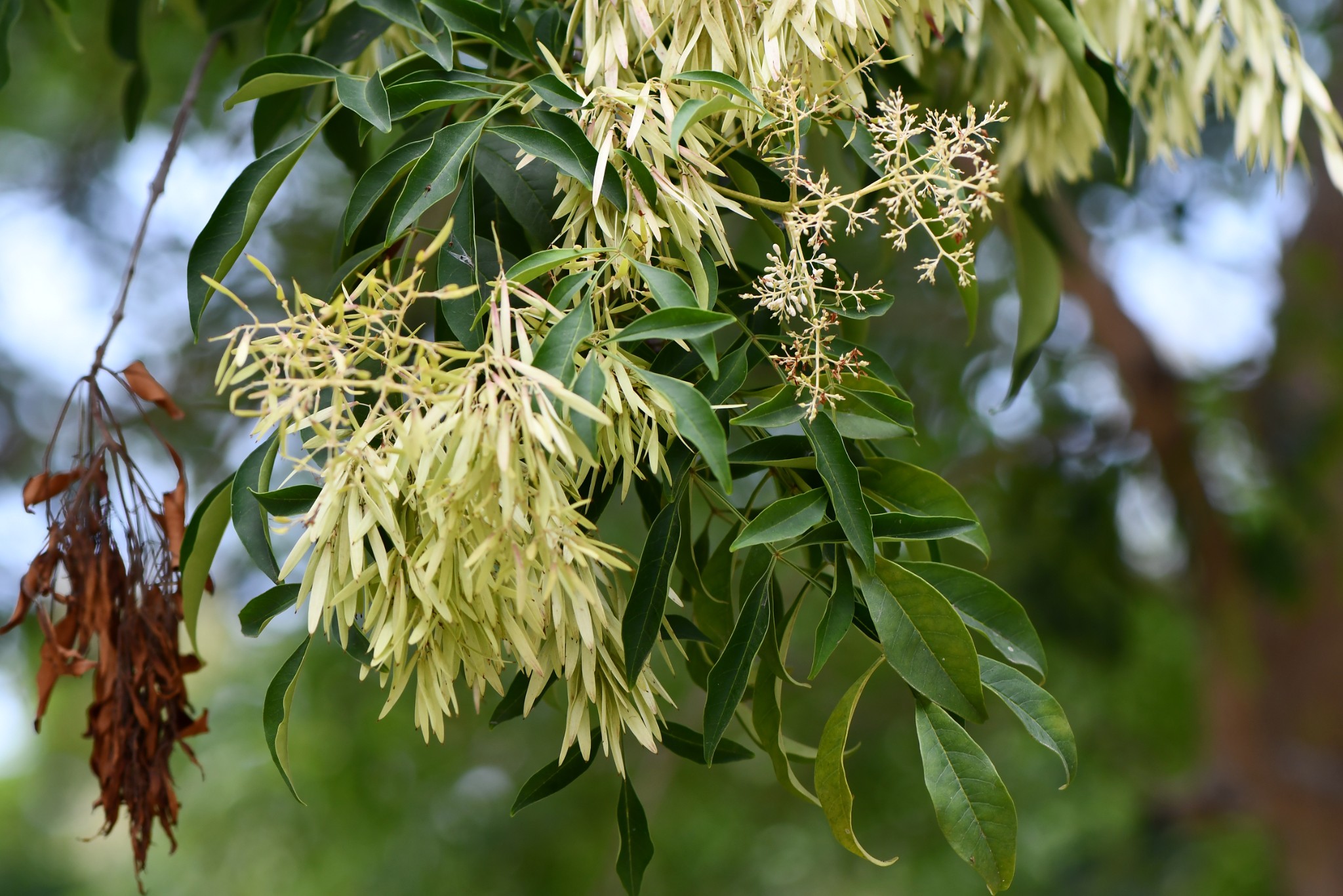 大型半落葉性喬木,樹皮斑駁狀,小分枝圓柱狀,微被毛。一回奇數羽狀複葉,互生,葉柄長1.5-5.5公分,小葉5-7枚,葉近紙質,具光澤,小葉橢圓形、 歪基卵形或披針形,全緣,先端銳尖至漸尖且具小尖突,葉基楔形或銳尖。複聚繖花序,頂生,花序與葉近等長,密生,花冠白色,花萼杯狀,花冠筒狀,4裂。翅果多數,倒卵狀長橢圓形,成熟時淺黃褐色,先端鈍或微凹。