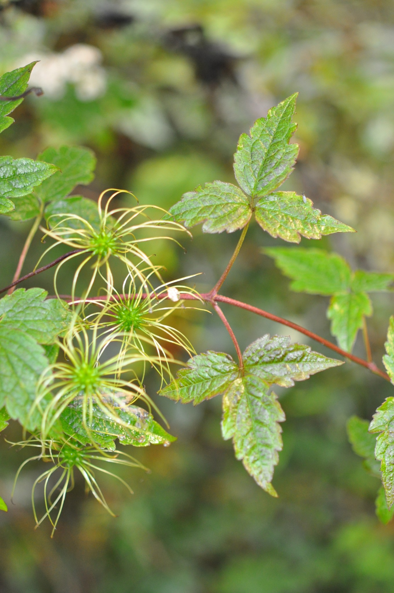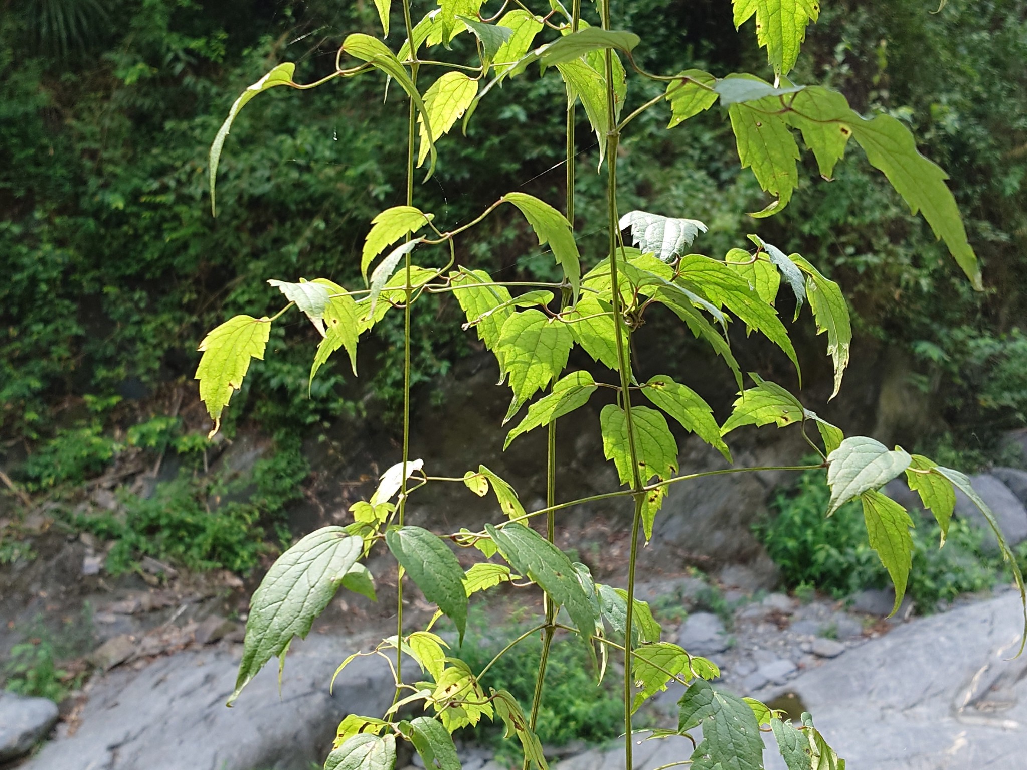 蔓性多年生木質藤本,莖有溝,被短柔毛。三出複葉、羽狀複葉或二回三出複葉,葉紙質,葉柄捲鬚狀,長4.2-9.7公分,小葉3-9片,長2.3-13.1公分,寬1.1-10.1公分,卵形、三角形或長橢圓形,先端漸尖,葉基心形、楔形或鈍狀,葉緣粗鋸齒,主脈3-5。圓錐狀花序聚繖排列,或聚繖花序,腋生,花梗三叉分枝,花直徑1.5-2.5公分,黃綠色或淺黃色,疏鬆,花萼4枚,雄蕊多數,花葯縱向開裂,心皮多數。瘦果卵形至橢圓形,深棕色至黑色,被淺黃色短柔毛。
