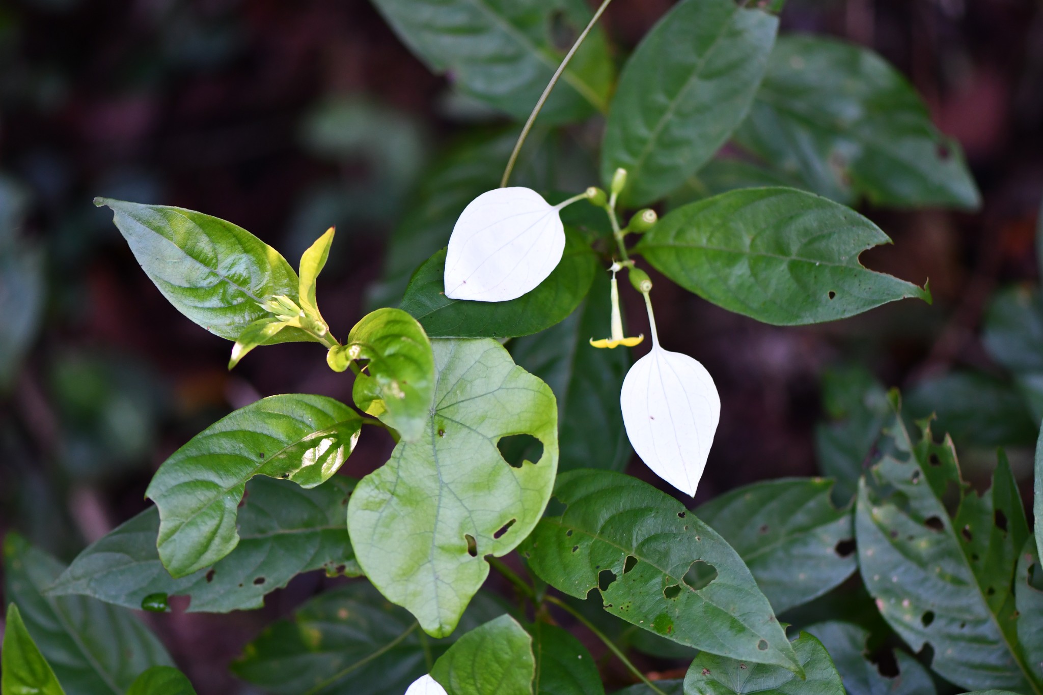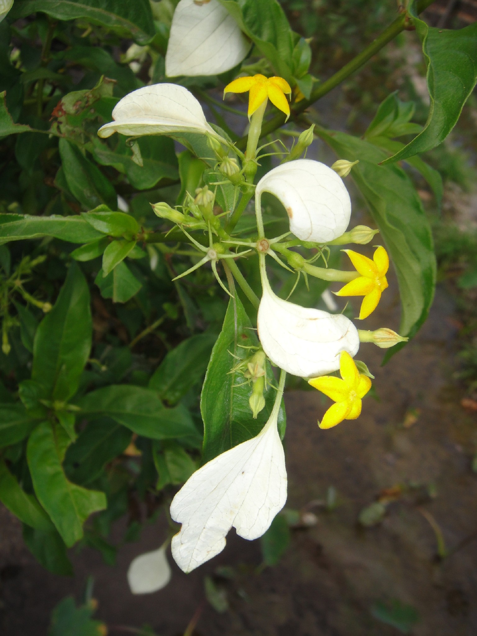 蔓狀藤本至亞灌木,枝細長。單葉對生,有柄,托葉二叉,狹三角形,葉卵狀矩圓形至卵狀長橢圓形,長6-12公分,寬2.5-5公分,先端尖或尾狀,葉基鈍形,全緣,近革質,具光澤。聚繖花序頂生,花萼5深裂。常具1-2枚大型葉狀苞片,白色,花冠漏斗狀,金黃色,先端5裂,雄蕊5枚,子房上位,卵圓形,柱頭2歧。漿果橢圓形,成熟時黑紫色。花果期6-12月。