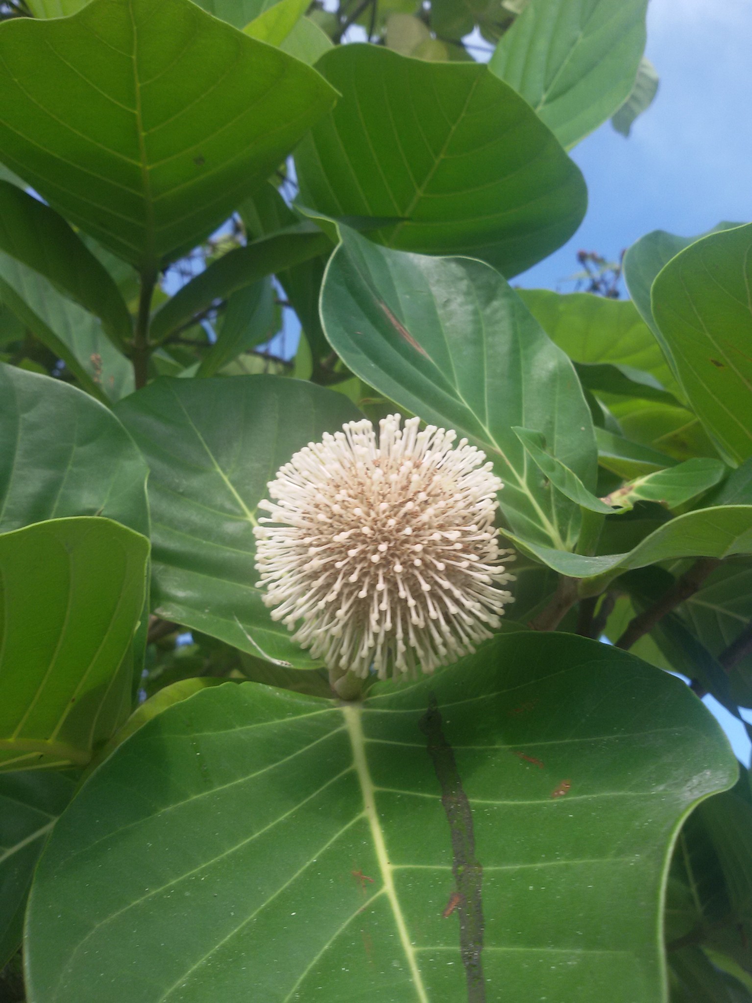 常綠大型喬木,分枝光滑。葉倒卵形、廣倒卵形或廣橢圓形,長約15-25公分,寬約10-14公分,先端銳尖至鈍,葉基楔形、鈍或心形,表面光滑。花聚生成頭狀花序,頂生,花序單一或2-5枚簇生,花冠白色,漏斗狀。蒴果縱裂,聚生成球形頭狀。種子多數,扁平具翼。