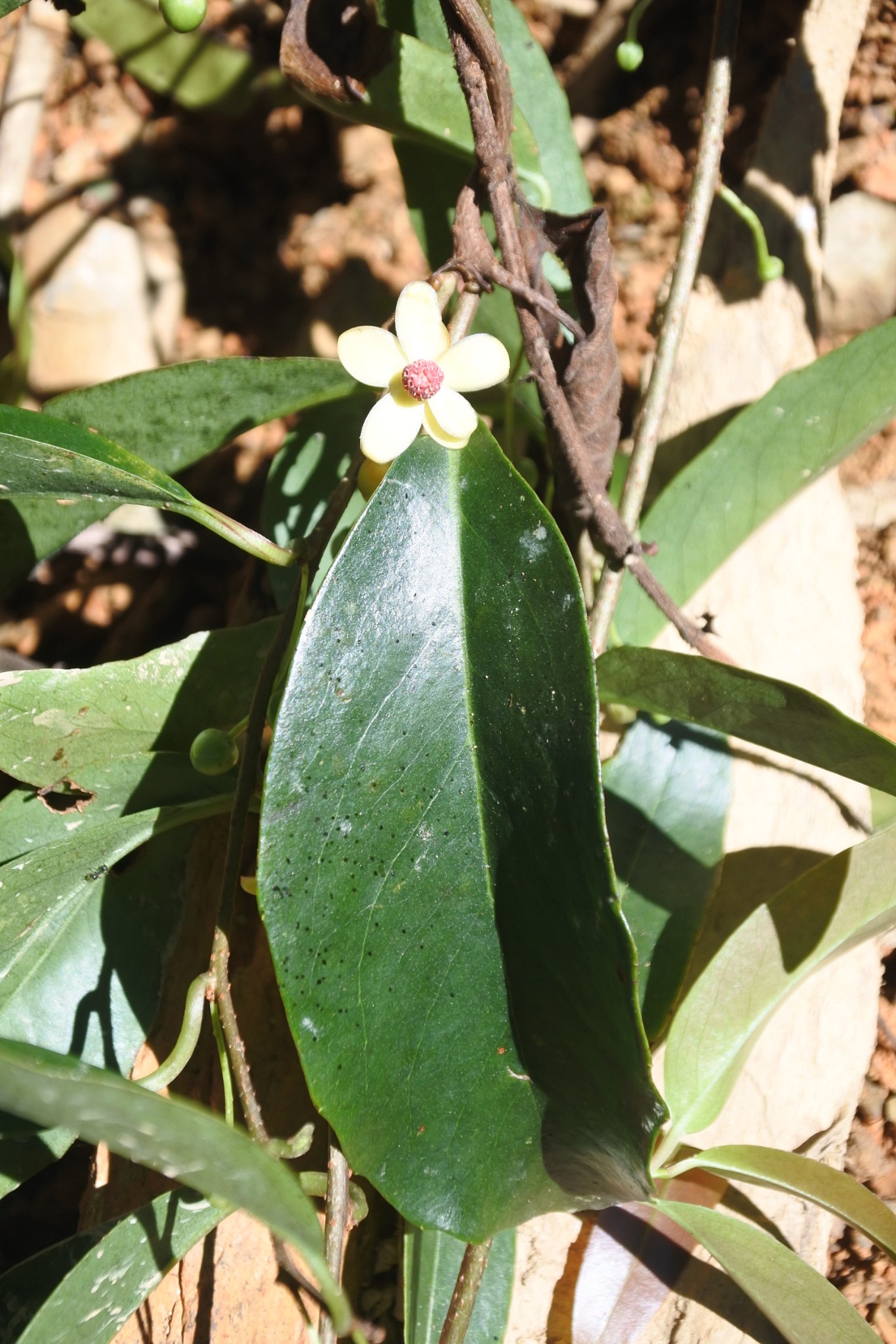 常綠藤本,莖暗褐色。單葉互生,柄長1.5-3公分,葉橢圓形或橢圓狀披針形,長5-10公分,寬2-5公分,先端尖形,葉基楔形,全緣或微鋸齒緣,葉厚質。雌雄異株,花單生葉腋,下垂,花淡乳黃白色,徑約1.6公分。花被9-15枚,雄花雄蕊多數,雌花之心皮40-50枚,離生,聚集成球狀。漿果熟時紫紅色。每心皮種子1-3粒,腎形。花期6-8月。果期8-11月。