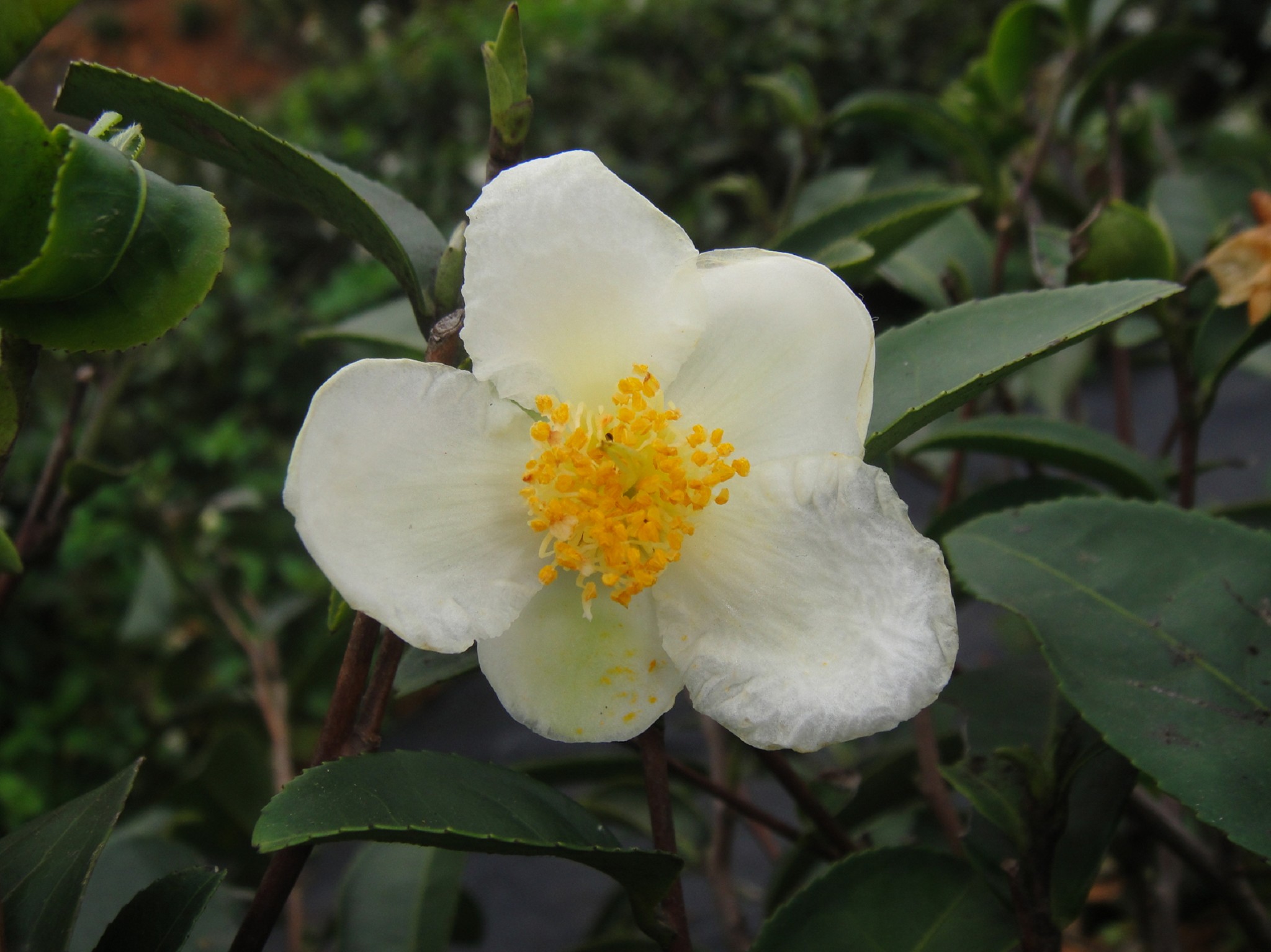 常綠灌木或小喬木,樹皮黃褐色,幼枝被毛。單葉互生,葉柄長0.6公分,葉革質,深綠色,橢圓形或卵狀橢圓形,長5-8公分,寬2-4公分,先端漸尖或鈍尖,葉基鈍狀或漸尖,細鋸齒緣。花1-3朵,頂生或腋生,花瓣白色,5枚,徑0.3-0.5公分,萼片圓形,被毛,雄蕊多數,2輪。蒴果球形,種子1-3粒。花果期9-11月。