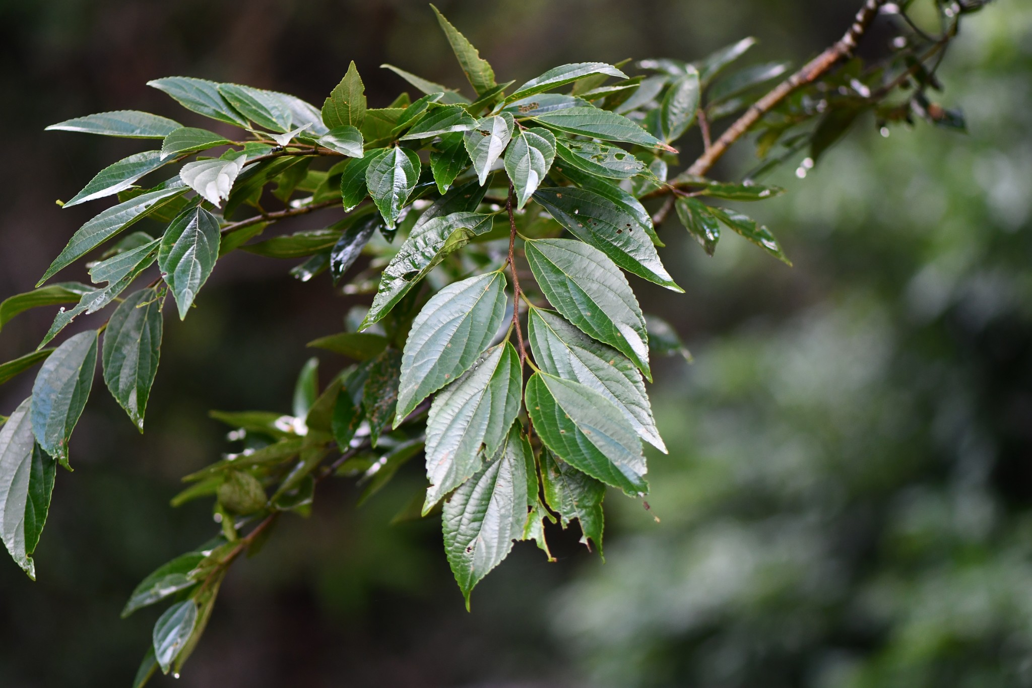 常綠喬木。樹幹灰白色,具痂狀突起。單葉互生,長卵形,長5-13公分,寬3-5.5公分,先端漸尖,歪基,鋸齒緣,光滑無毛,紙質。單性花,腋生,雄花簇生,雌花單生,花被片不明顯,花萼光滑邊緣被毛,雄蕊4枚,柱頭兩裂,花萼光滑邊緣被毛。卵形核果,成熟轉橙黃。