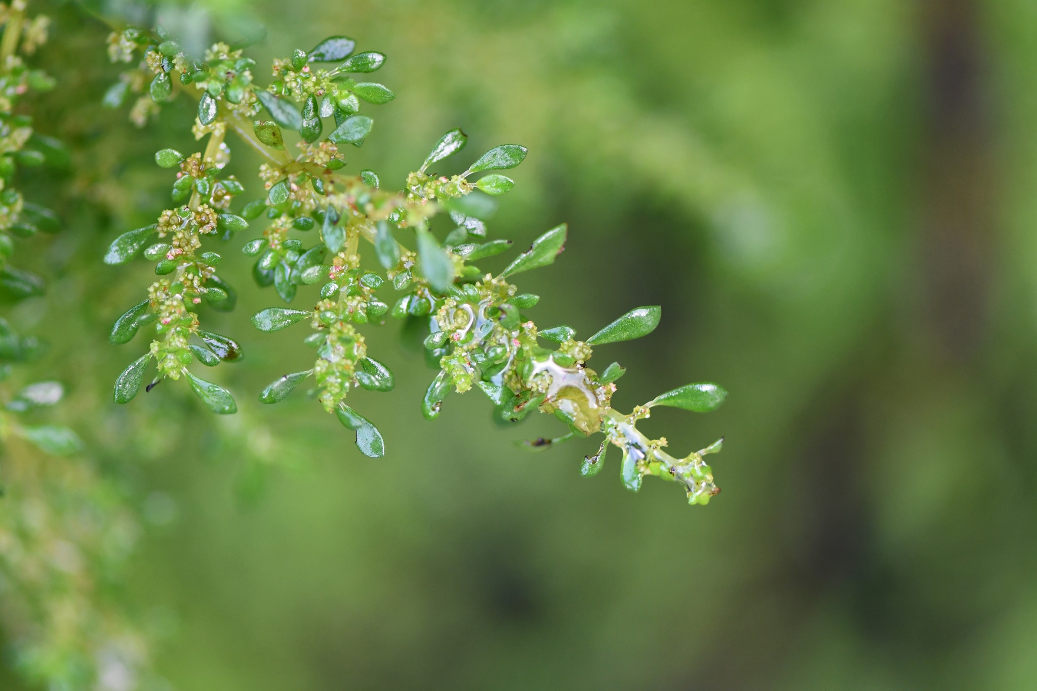 一年生草本,直立或斜上生長,莖多汁。葉對生,每對葉不等大,肉質,狹倒卵形至倒卵狀橢圓形,長0.6公分,寬0.25公分,先端鈍狀,全緣,基部楔形,羽狀脈,葉柄長0.25公分。雄花序腋生,近無柄,聚繖花序聚集成團繖狀,長約0.3公分,無苞片,雄花花萼3-4枚,基部連生至1/2處。雌花花萼3-4枚,基部連生,花萼不等大,退化雄蕊3枚,子房光滑,橢圓形。瘦果表面有瘤,橢圓狀。