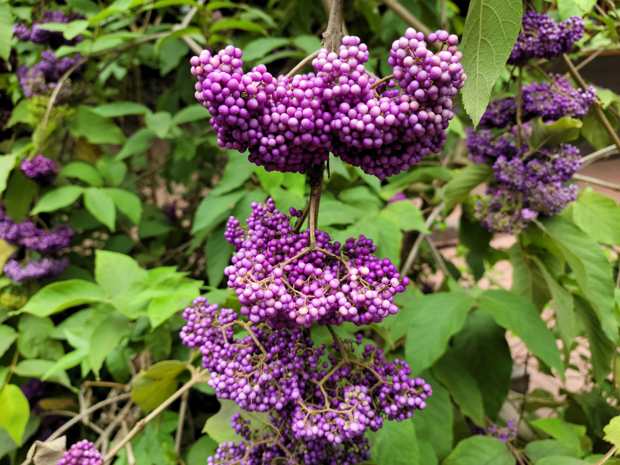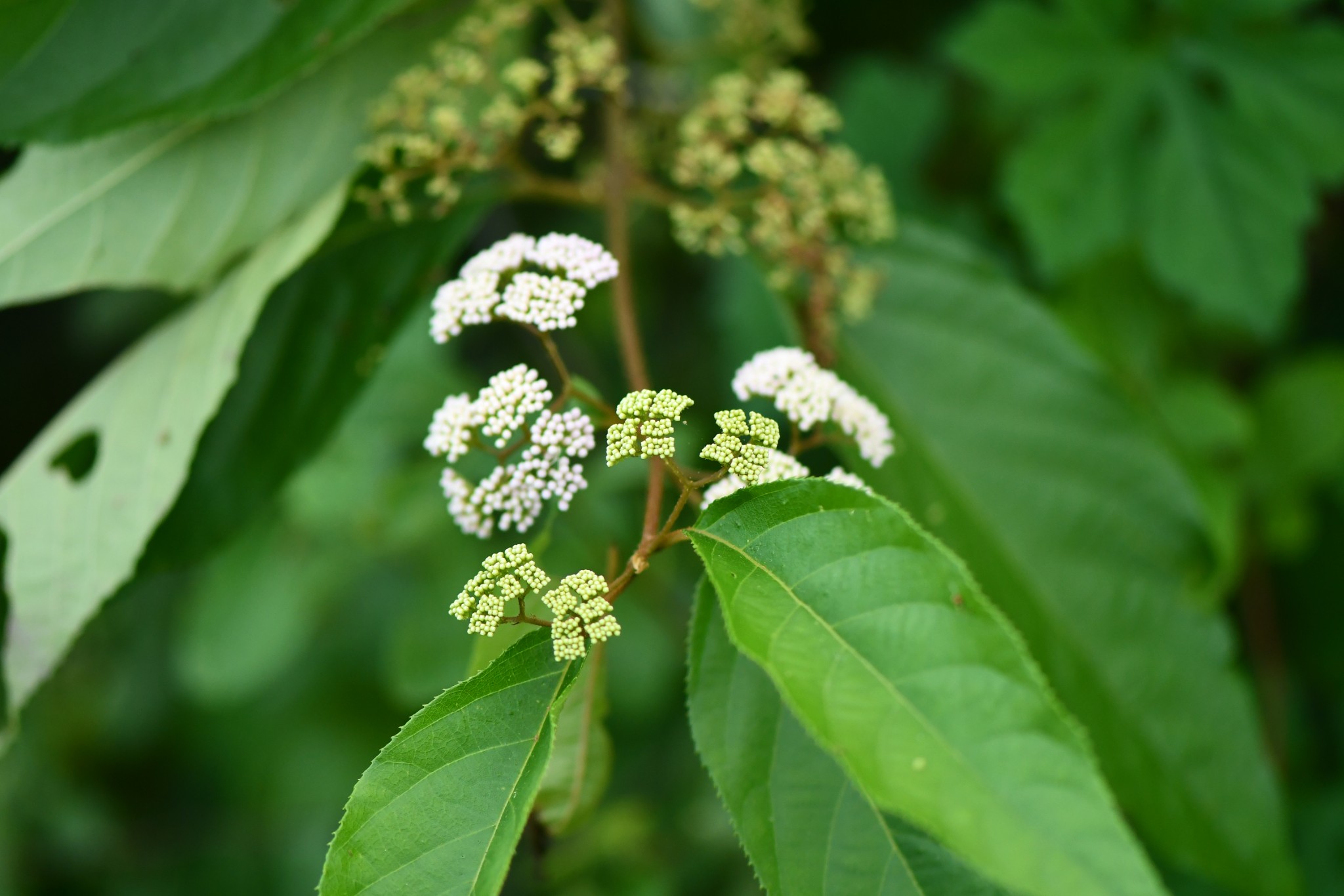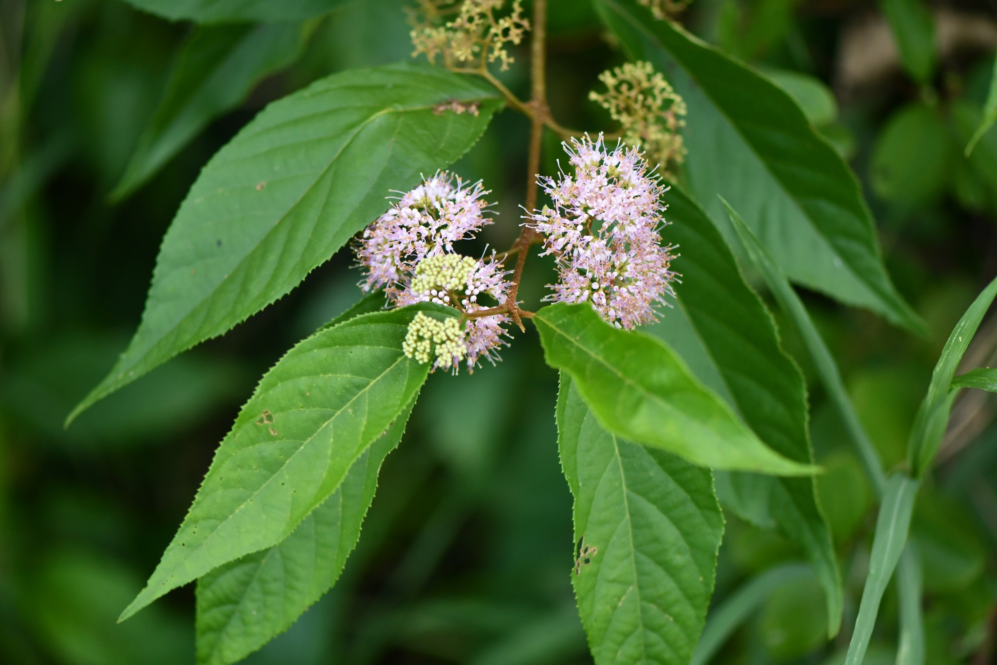 常綠灌木,株高2-4.5公尺。全株被星狀毛。單葉對生,卵形至長橢圓形,長7-18公分,寬1-4公分,先端漸尖,基部楔形至鈍形,鋸齒緣,葉兩面被毛。腋生聚繖花序,管狀花,粉紅色至淡紫色,雄蕊4枚,2強,細長明顯。球形核果,徑2公釐,表面光滑,成熟轉深紫色,果期夏季。