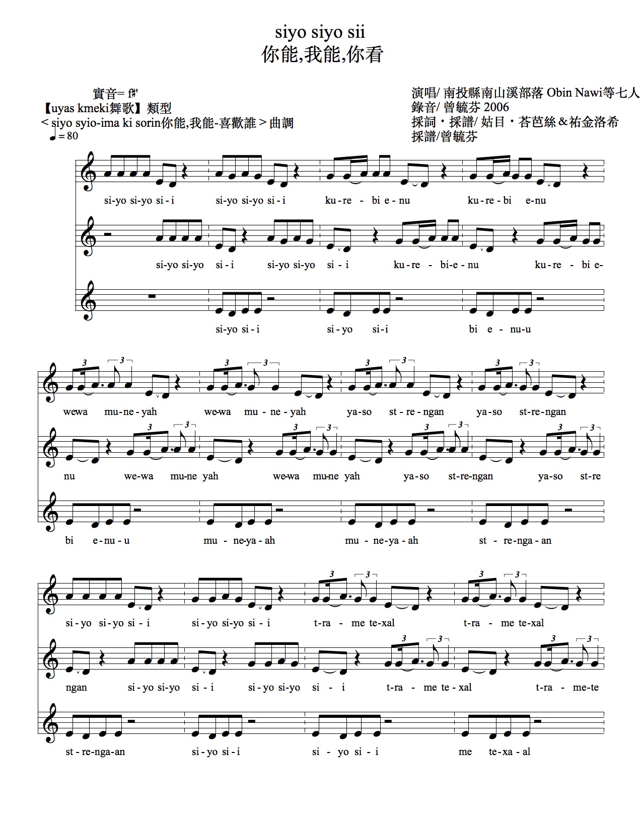 【譜1】南投縣南山溪部落Obin Nawi等7人演唱uyas kmeki之〈siyo siyo〉(你能,我能)。(曾毓芬錄音、製譜,2006年12月7日)