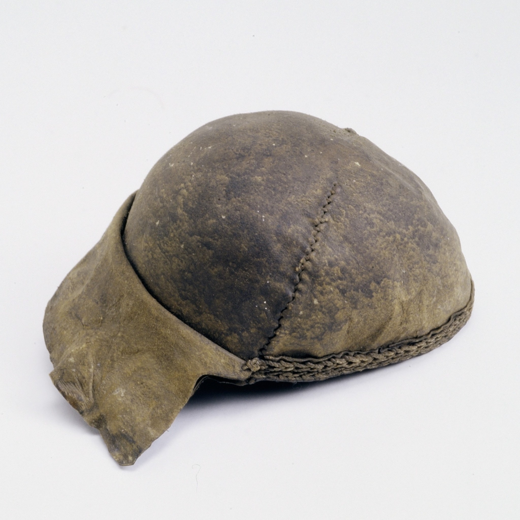 1.形如水瓢的硬殼皮帽:穿戴時將皮帽套住頭部,將頭髮塞入皮帽後端如水瓢的把手。