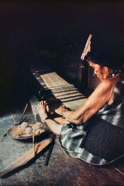 【圖15】雅美族婦女於傳統主屋簷廊使用織機織布的工作情景。(凃寬裕拍攝,1980年)