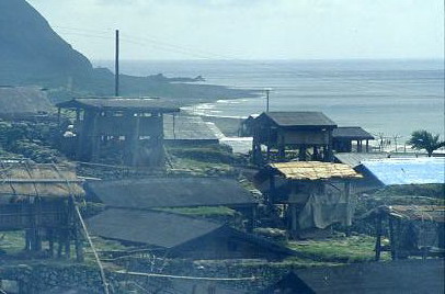 【圖1】蘭嶼野銀部落傳統屋群,其中,屋脊與海岸線垂直之建築物,即為傳統家屋中的高屋(Makarang,工作房)。(楊政賢拍攝,2016年)
