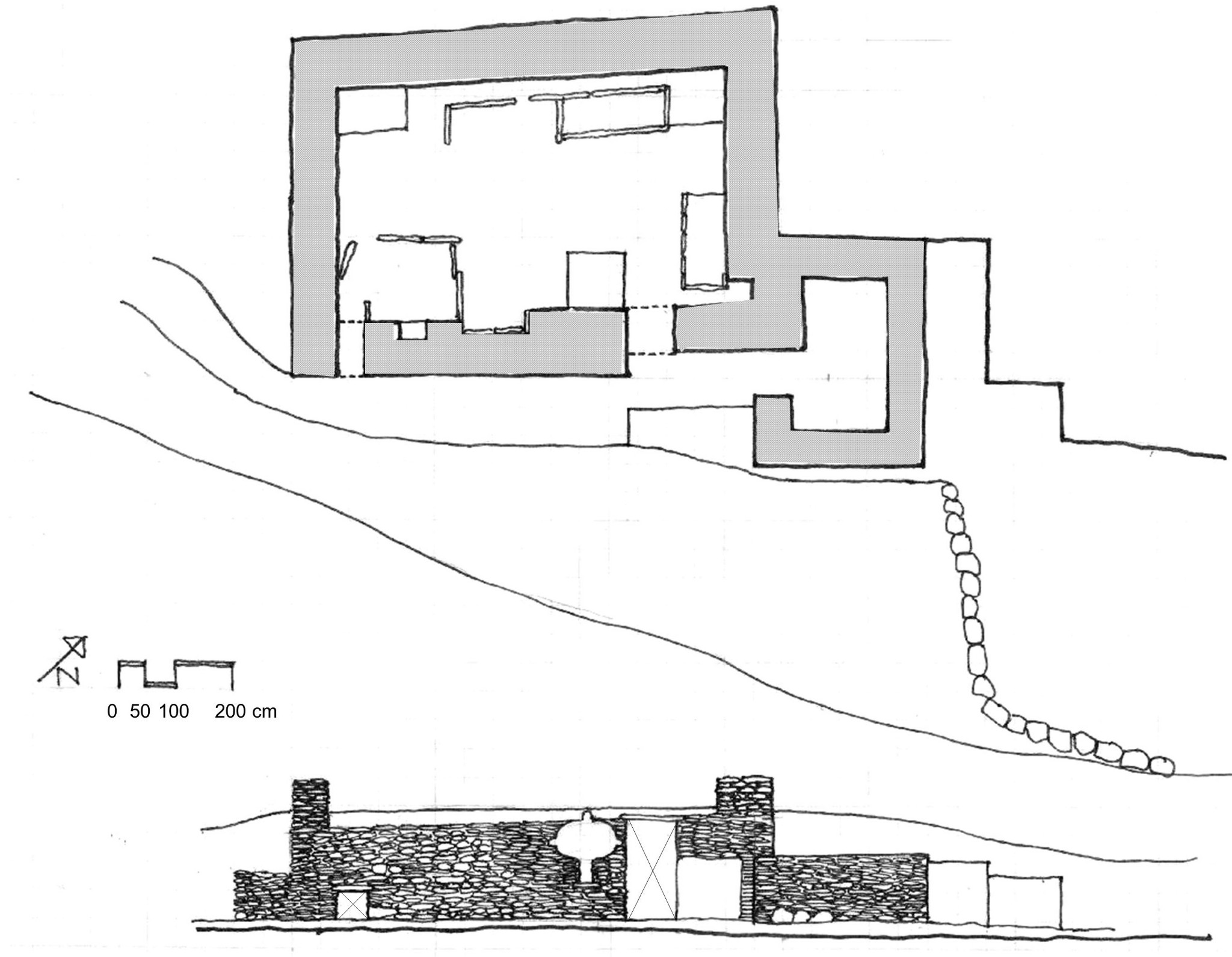 【圖1】萬山藍家平面及正立面遺構示意圖。(許勝發繪製)