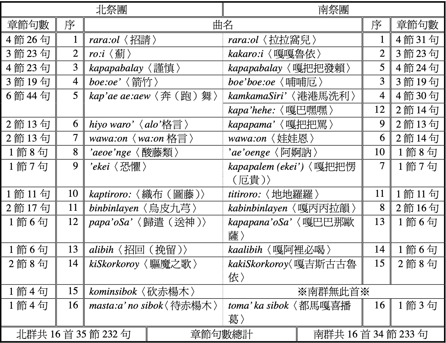 【表1】南北祭團的矮靈祭祭歌曲目、章節統計。(依據根穆凡,〈賽夏族paSta’ay(矮靈祭)祭歌研究〉頁37)