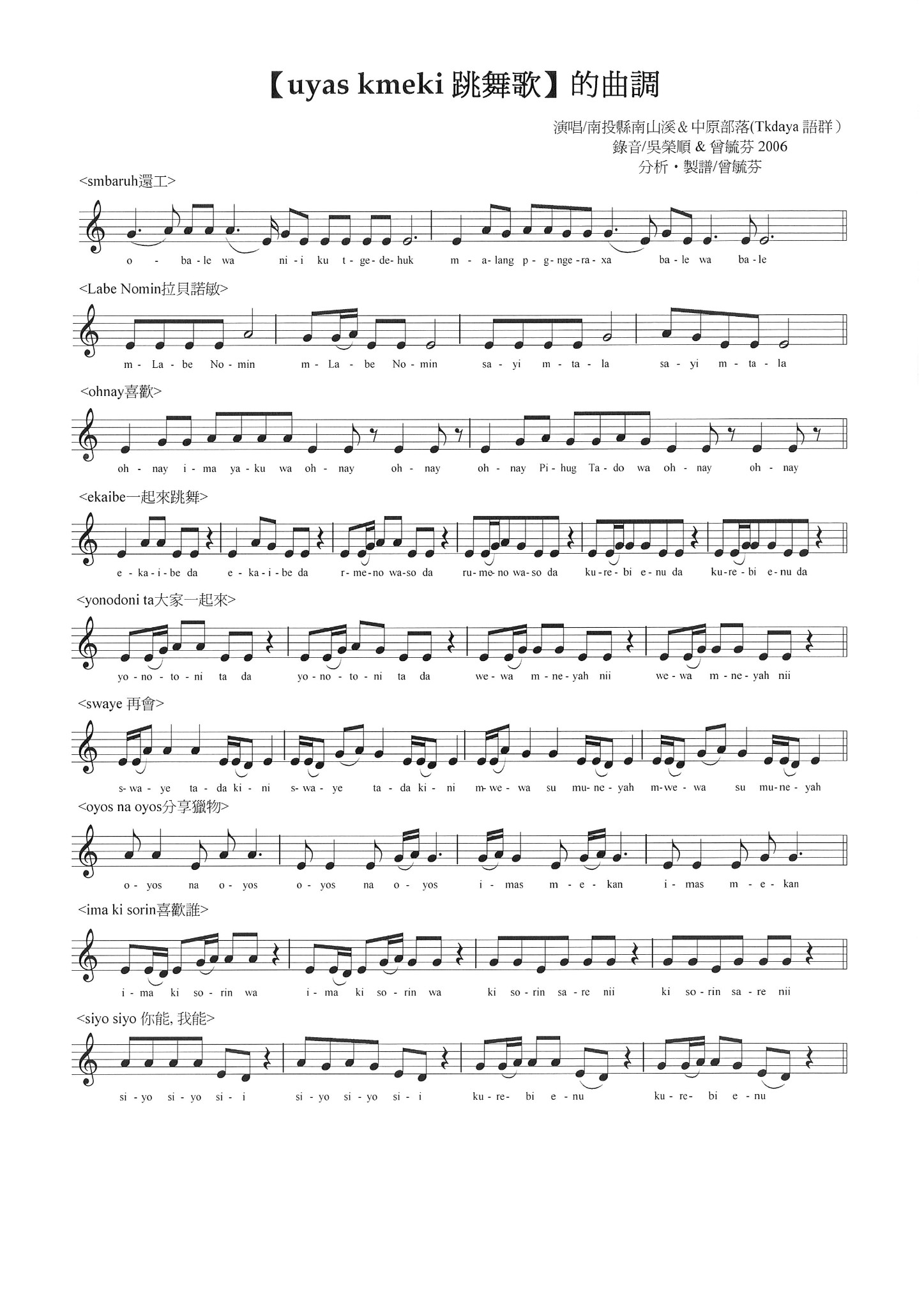 【譜1】目前在南投縣仁愛鄉賽德克族境內傳唱著的uyas kmeki曲調。(曾毓芬分析、製譜,2006年12月)